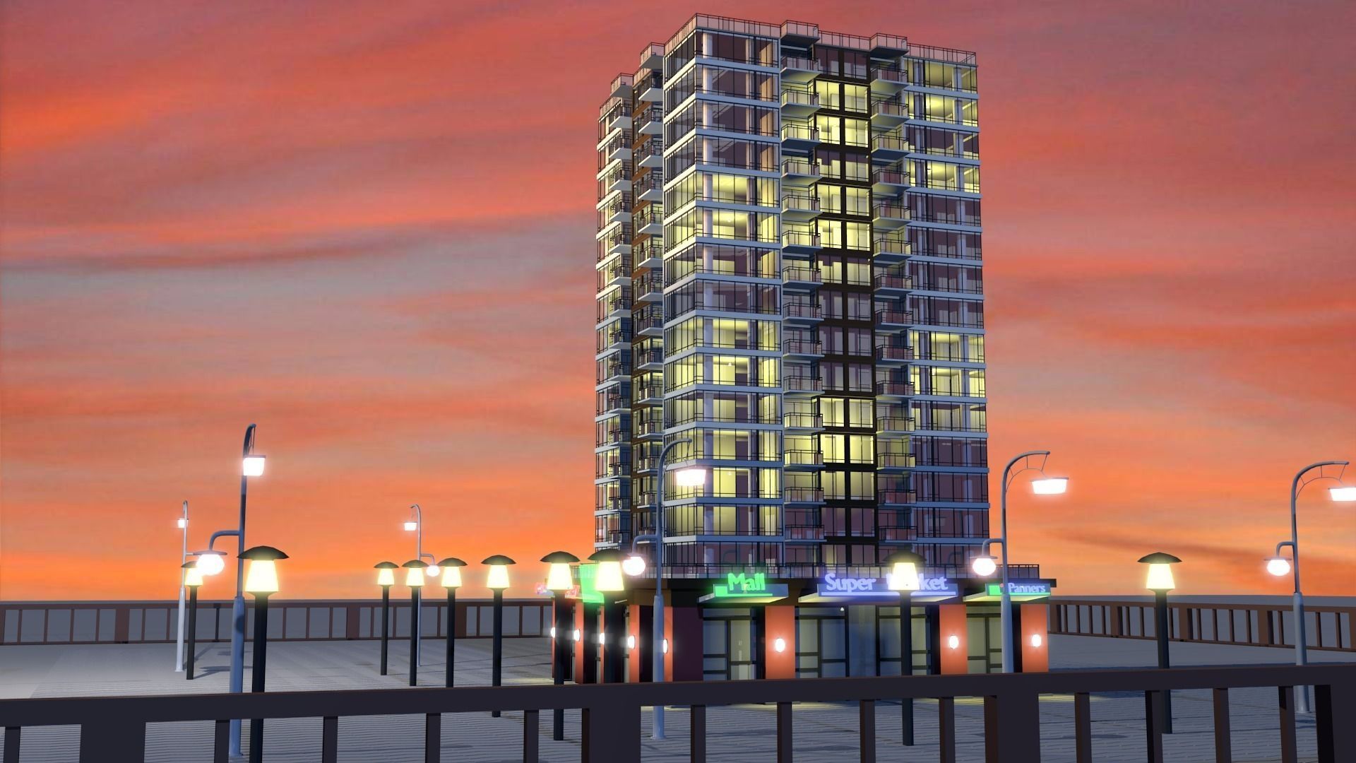 The animated video of this building is found here: https://www.youtube.com/watch?v=HMdP1oIof0s This block of flats is carefully modeled vertex-to-vertex, edge-to-edge and face-to-face to provide a ready-to-use apartments with in-despicable quality. The building concentrates more of the exterior although the rooms are divided to give a photo realism of the final render. The ground has real tiles and the street lights are well positioned. There is also a fence to enclose the entire compound. All faces are 4 vertex to meet the conventional requirements of 3D models for quick and seamless rendering. It has captured the finest of details and thus can accommodate a close up render. It has real world dimension thus fitting into your scene perfectly. the mesh has no complications as to do with modifiers or subdivisions, NURBS or textures thus is easy to use readily.