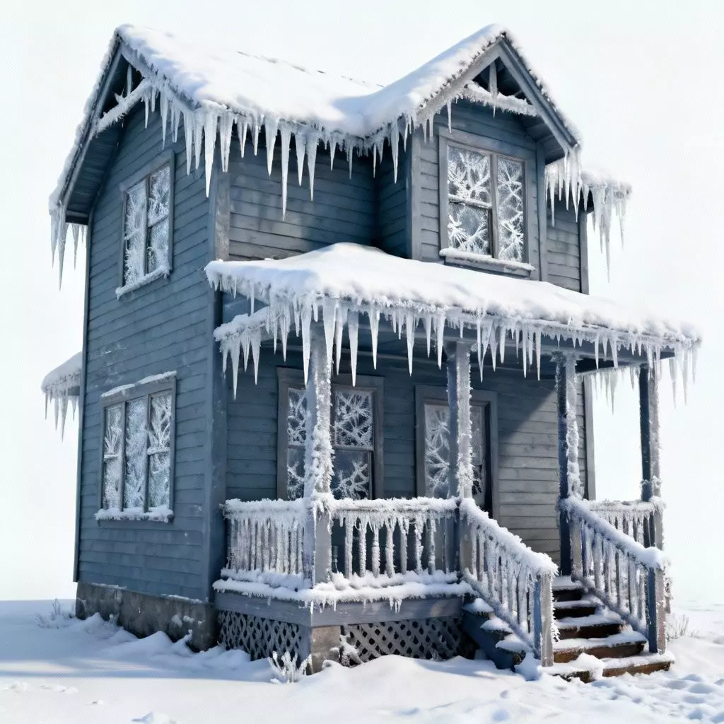 Massive Icicle Drapes The most terrifying feature is the curtain of long, sharp icicles hanging from every roof edge and porch beam. These aren't just decorations; they look dangerous and heavy, encasing the upper part of the house in a cage of ice.