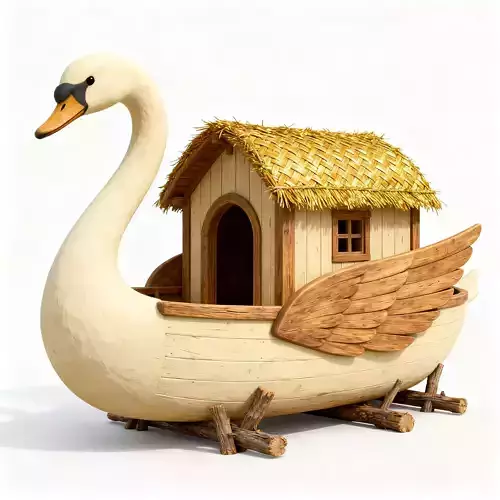 Thatch-Roofed Cottage CabinMounted in the center of the swan is a small, high-detail wooden cabin. It features a steep gabled roof covered in thick, golden-yellow thatch, giving the asset a warm and rustic shabby-chic aesthetic.