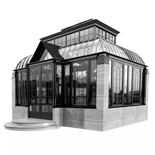 High-quality 3D model of a classic Victorian-style glass conservatory, featuring arched glass panels, black metal framing, and brick base walls. This elegant structure is ideal for architectural visualization of luxurious gardens, indoor lounges, or tea rooms.