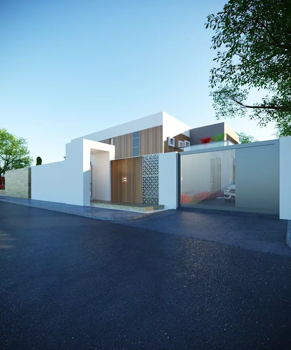 The façade incorporates modern mashrabiya-inspired panels that enhance privacy while adding depth and character to the overall composition. Large openings and well-placed architectural lighting create a realistic interaction between light and shadow, making the model ideal for high-end architectural visualization and presentation.
