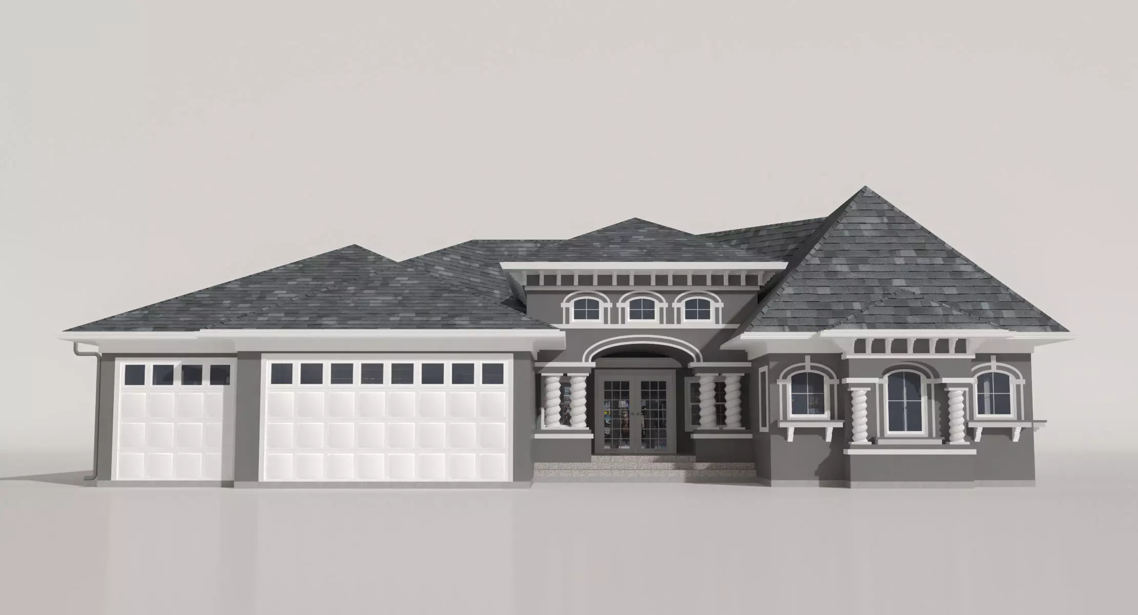 1 story Home w. Stucco and 2 attached garages.High Detail model w. Rounded columns and two tone stucco finish, ready for up close renderings