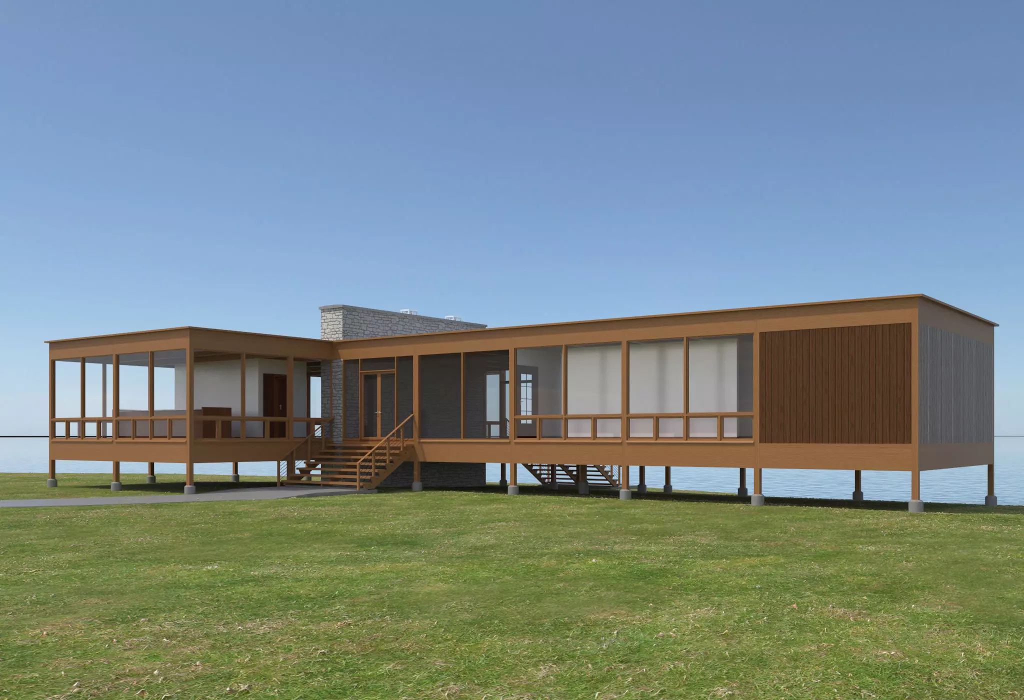 3D model of a Summer House Located along a lake on a steeply graded site.-House is wood construction on a bay grid. 1 Side is living quarter (living room, kitchen, powder room, closet), 2nd Side is the sleeping quarters with 3 bedrooms, 2 bedrooms with shared bathroom and 1 master bedroom with private bathroom. The two sides are split from each other by a open mesh breezeway.