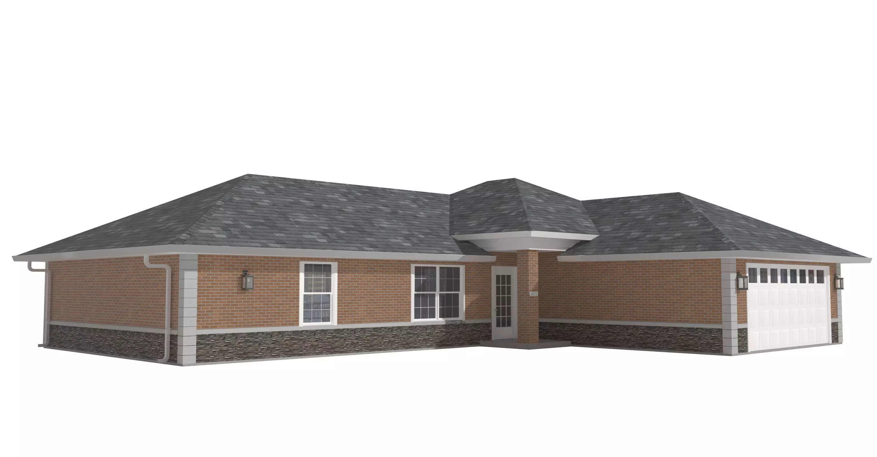Exterior Light fixture is Polygons:1,578, Vertices: 1,720Model without light fixtures: Polygons: 4,856, Vertices: 6,8889Materials: Shingles, Concrete, Brick, Cast Stone, Stone Base, Metal Panel., misc.