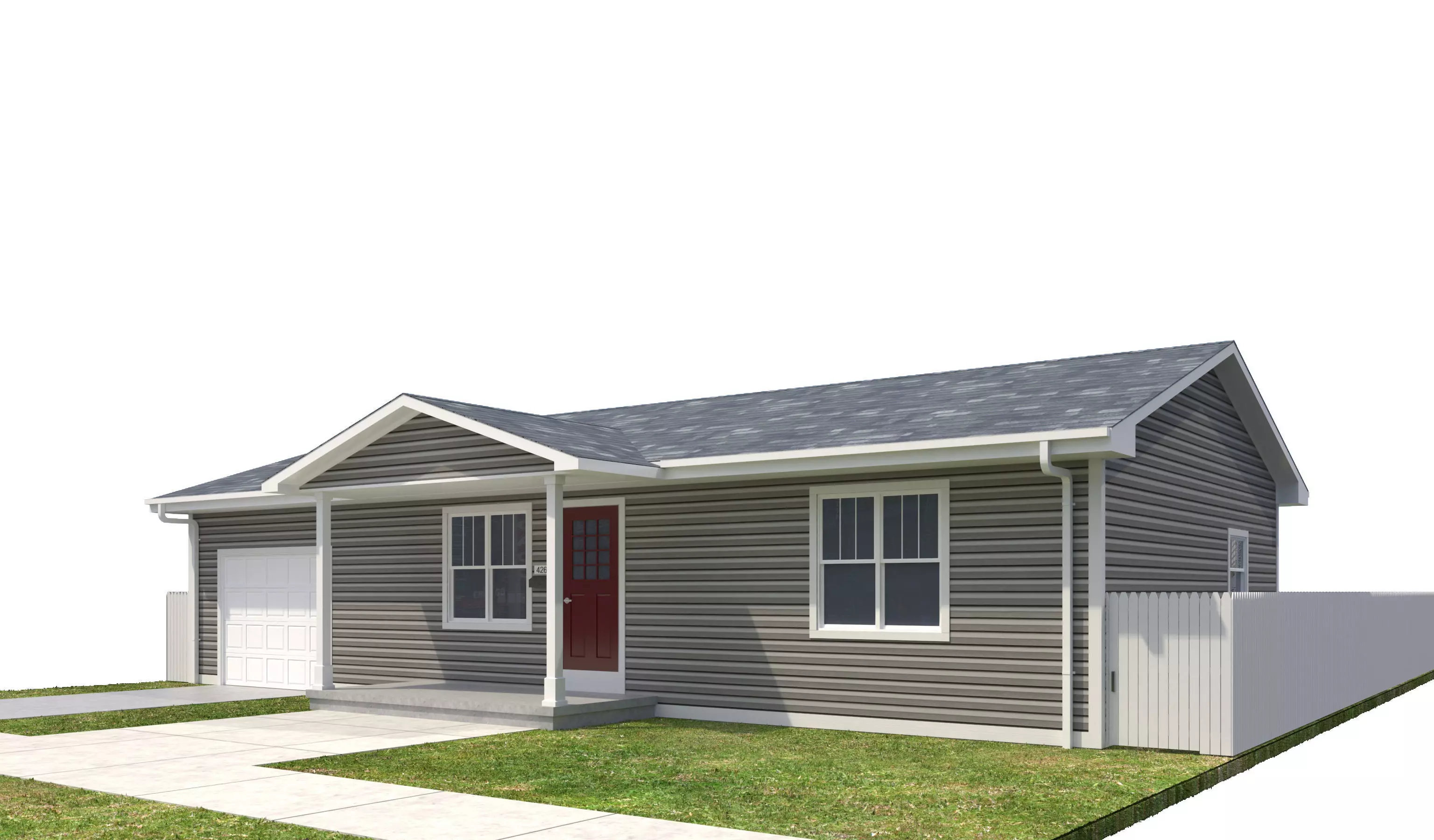 +/- 1,313 Square Foot 1 story Home With Garage. House has Gray Horizontal Siding with White Trim and Red DoorHigh Detail Exterior Model including doors and windows. Interior is NOT modeled. House also incldues entire site, including yard, sidewalks, fence, driveway, curb and curb cut, grass. This house will be part of a series that will make up an entire city block.