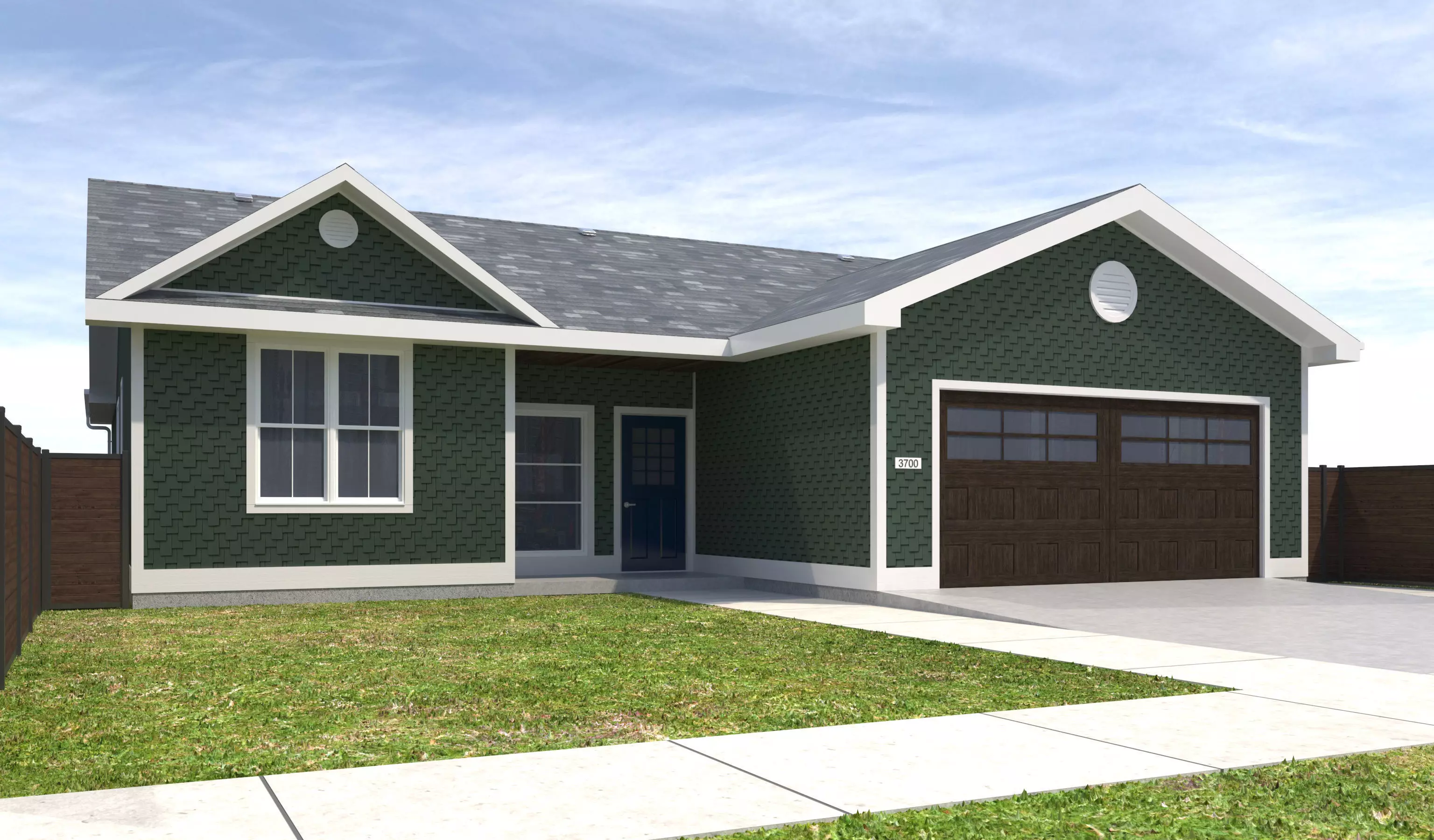 - +/- 2,835 Square Foot 1 story Home with a Garage . House has Green Siding/Shingle Exterior Walls. White Window Frames, Blue Doors. Property has a Dark Wood fence. House has a deck in the yard. House also incldues air vents on roof.