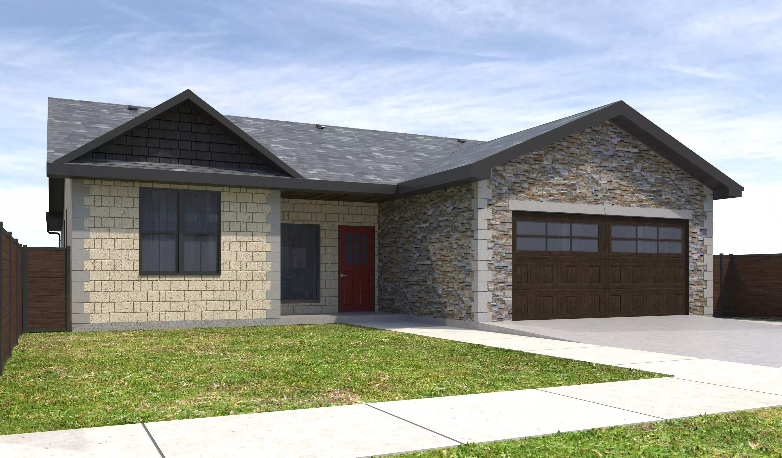 - High Detail Exterior Model. Interior is NOT modeled. House also includes entire site, including yard, sidewalks, fence,curb and curb cut, grass.