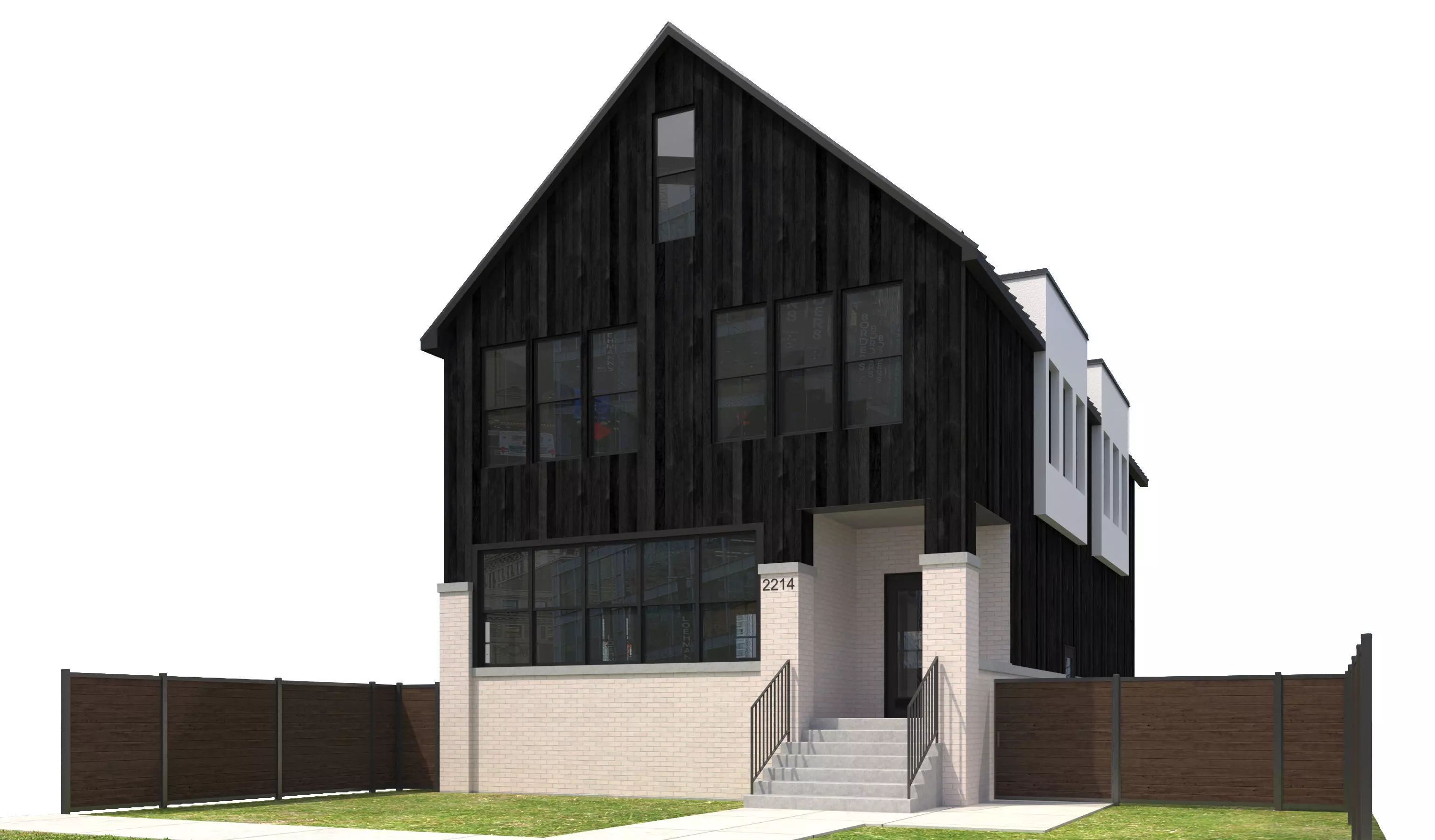 - +/- 3,340 Square Foot 2 Story Home with Attic . House has White Brick Walls with Stone Trim Details and Dark Black Wood Panels Above with White Stucco Addition. Black windows, black Doors. House has Black Standing Seam Metal roof with Snow guards. Property has a dark wood fence. House has a front porch entry with Stairs.