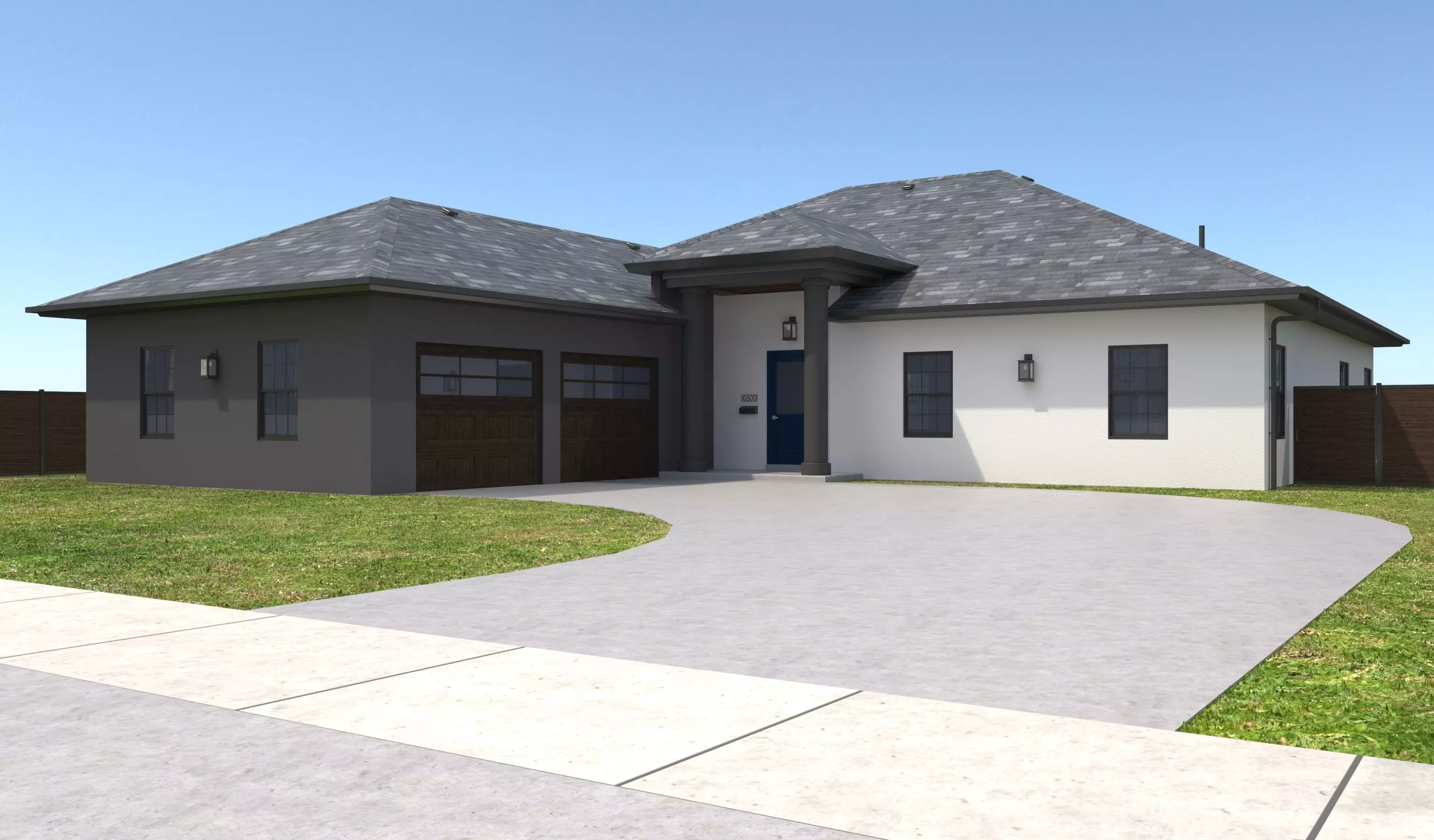 - +/- 2,964 Square Foot 1 story Home with dual door Garage . House has White and Dark Gray Exterior Stucco or Eifs Walls with , Black Window Frames, and Dark Blue Doors. Property has a Dark Wood fence, Dark garage doors and Roof Posts at Entry. Entry Ceiling below roof has wood panels.