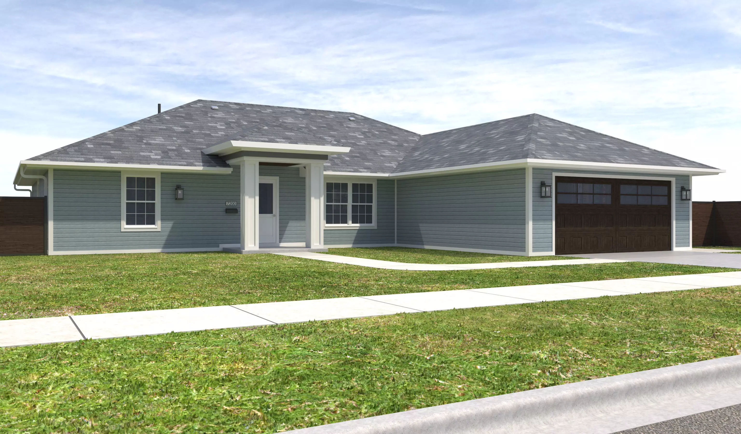 - +/- 2,168 Square Foot 1 story Home with Garage . House has Light Blue Siding Exterior Walls, White Window Frames, and White Doors. Property has a Dark Wood fence, Dark garage doors and White Roof Posts at Entry. Entry Ceiling below roof has wood panels.