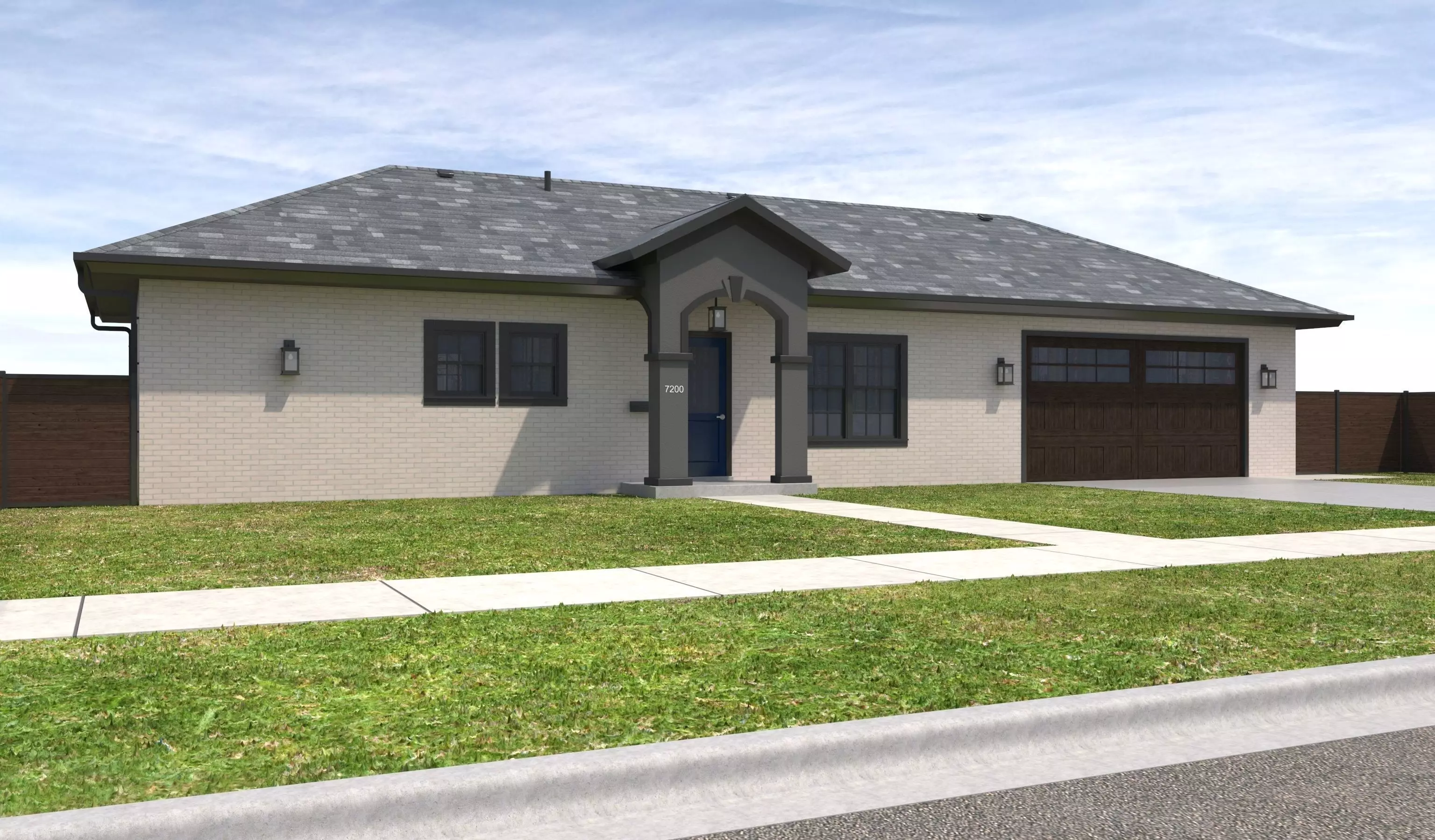 - +/- 1,536 Square Foot 1 story Home with Garage . House has White Brick Exterior Walls and Dark Gray Stucco Entry, Black Window Frames, and Dark Blue Doors. Property has a Dark Wood fence, Dark garage doors. Entry Ceiling below roof has wood panels.