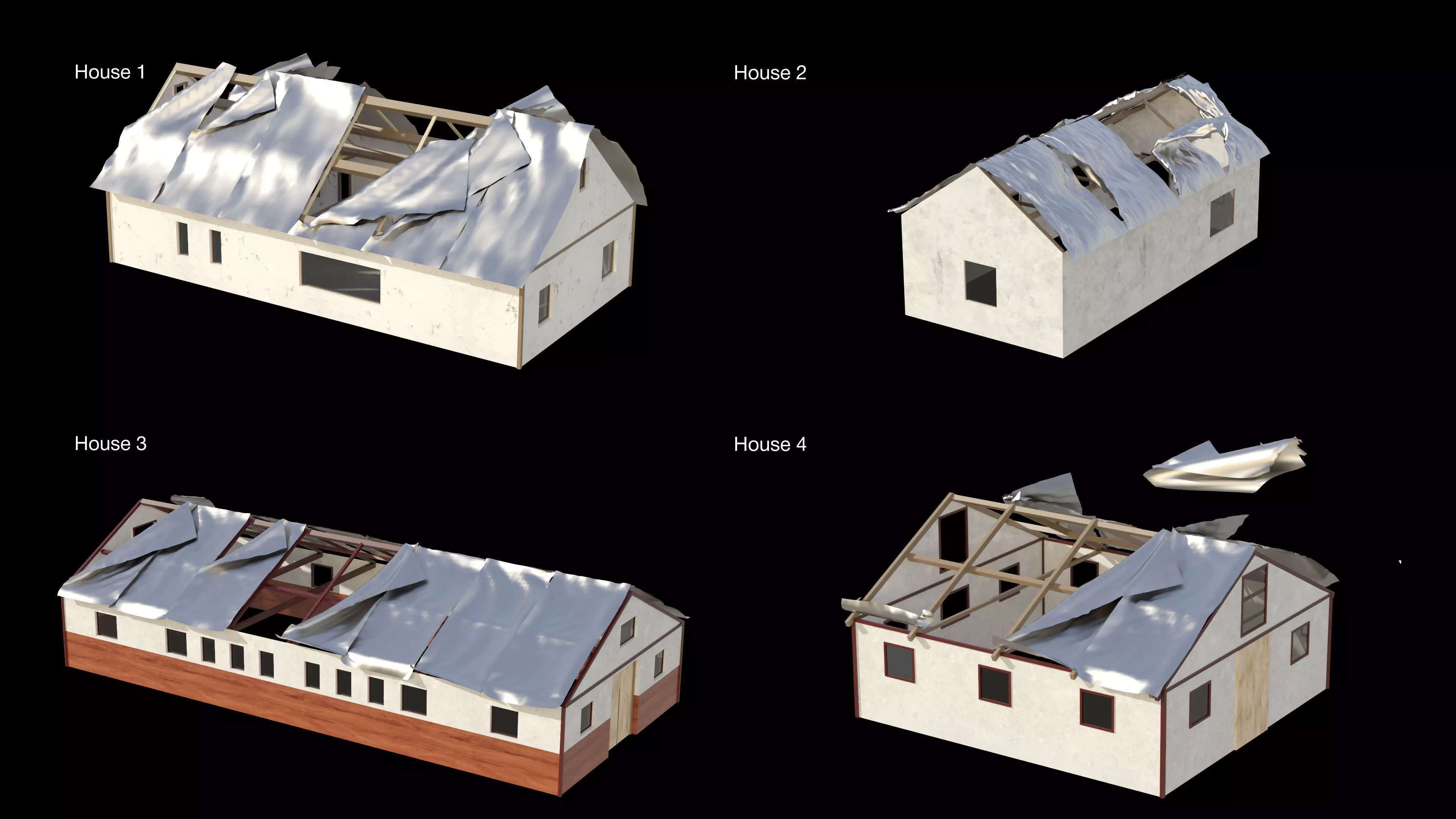 The pack includes four distinct house structures, each presenting a different damage pattern and severity level. Roof elements dynamically deform over time, revealing underlying wooden trusses and structural framing. This makes the asset suitable for disaster simulations, cinematic VFX shots, environmental storytelling, architectural visualization, and real-time applications requiring believable storm damage.