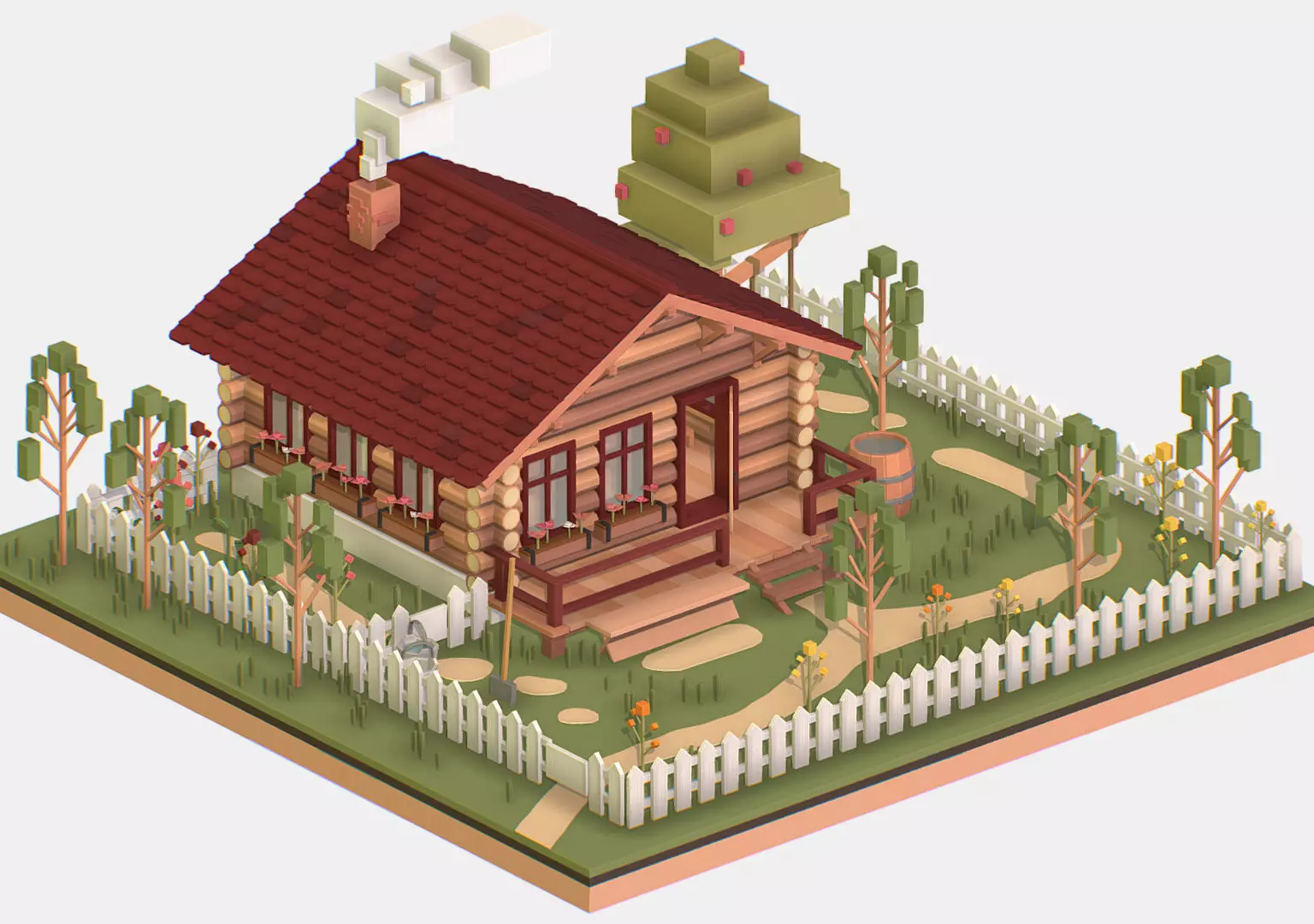 Isometric Village Wood Log House Cottage Garden Low-poly 3D model