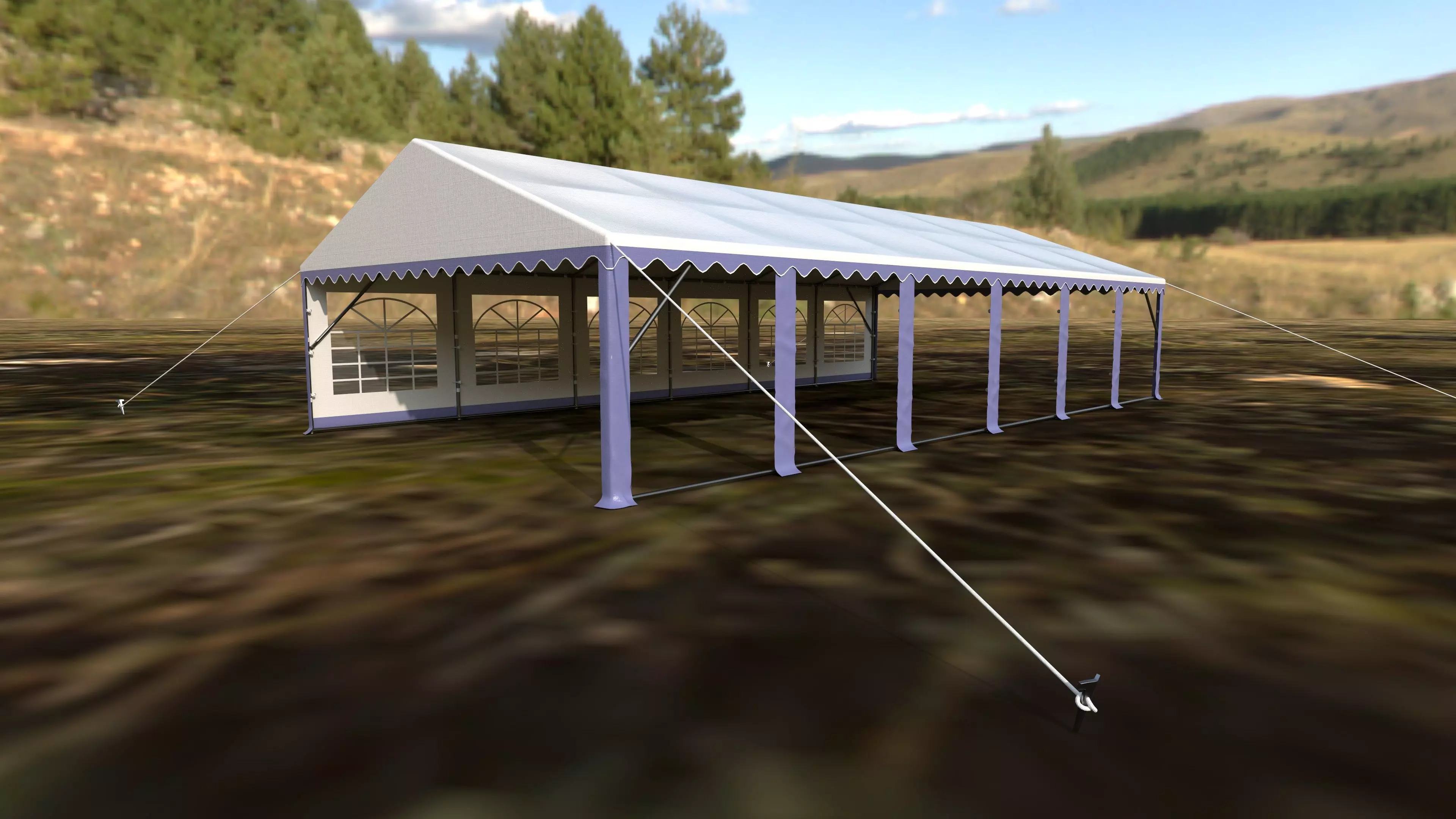This detailed 3D model of a large outdoor event tent is ideal for architectural visualization, animation, game development, or VR/AR scenes. Created in Autodesk Maya and textured in Substance Painter, this model captures realistic tent details like metal supports, ropes, fabric seams, and window panels.