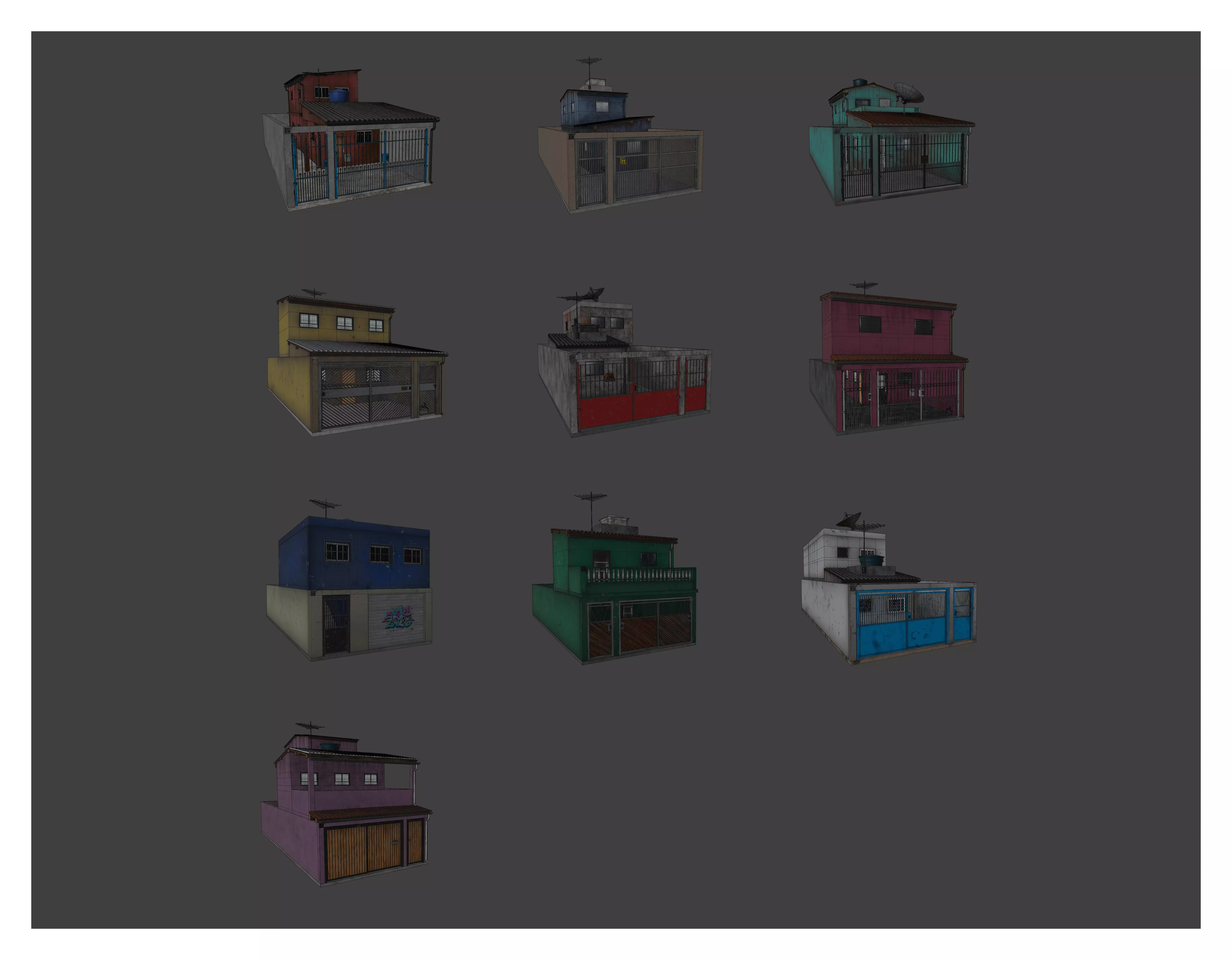 A collection with 10 low poly 3D models of Brazilian houses, Modeled in Blender and textured using Substance Painter.
