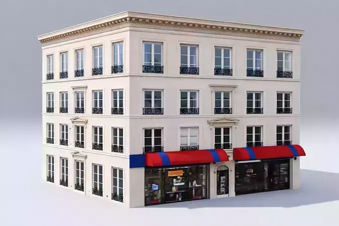 This high-quality 3D model features an elegant Parisian / European-style corner building with a clean, realistic architectural design. The structure includes four floors, detailed stone façades, classic French windows with iron railings, and ground-floor commercial storefronts enhanced by bold red-and-blue awnings.