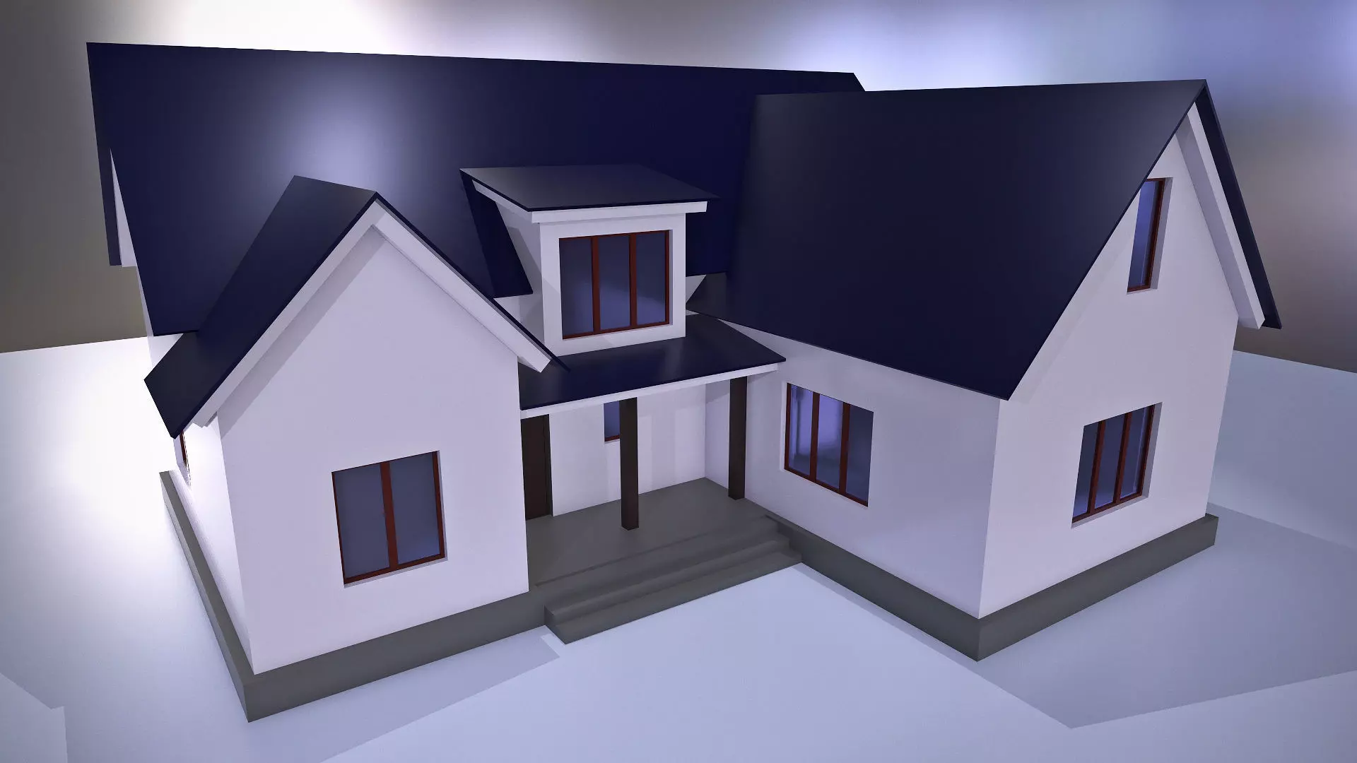 The model of a classic American country cottage with white facade and the dark grey roof. The second floor of the house is mansard. Two grey steps lead to a small porch and the entrance door. Window frames are dark brown. Ready for game-development, render and animation.