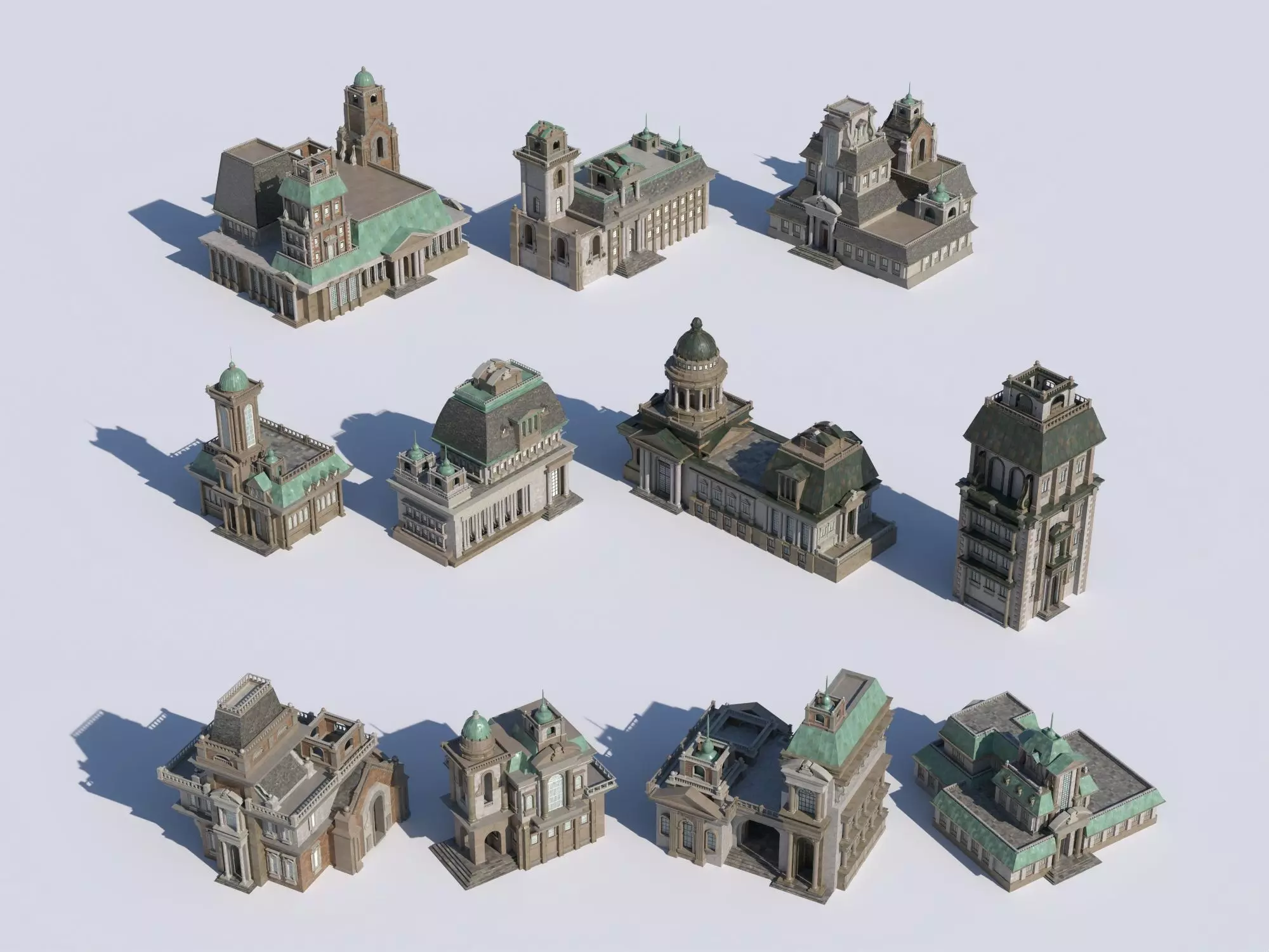 High-quality European classical style public buildings, inspired by historical architecture from the late 18th to early 20th centuries. This asset pack includes multiple unique buildings featuring towers, domes, columns, arches, and exquisite stone facades, perfect for creating realistic historical cities or grand scenes.
