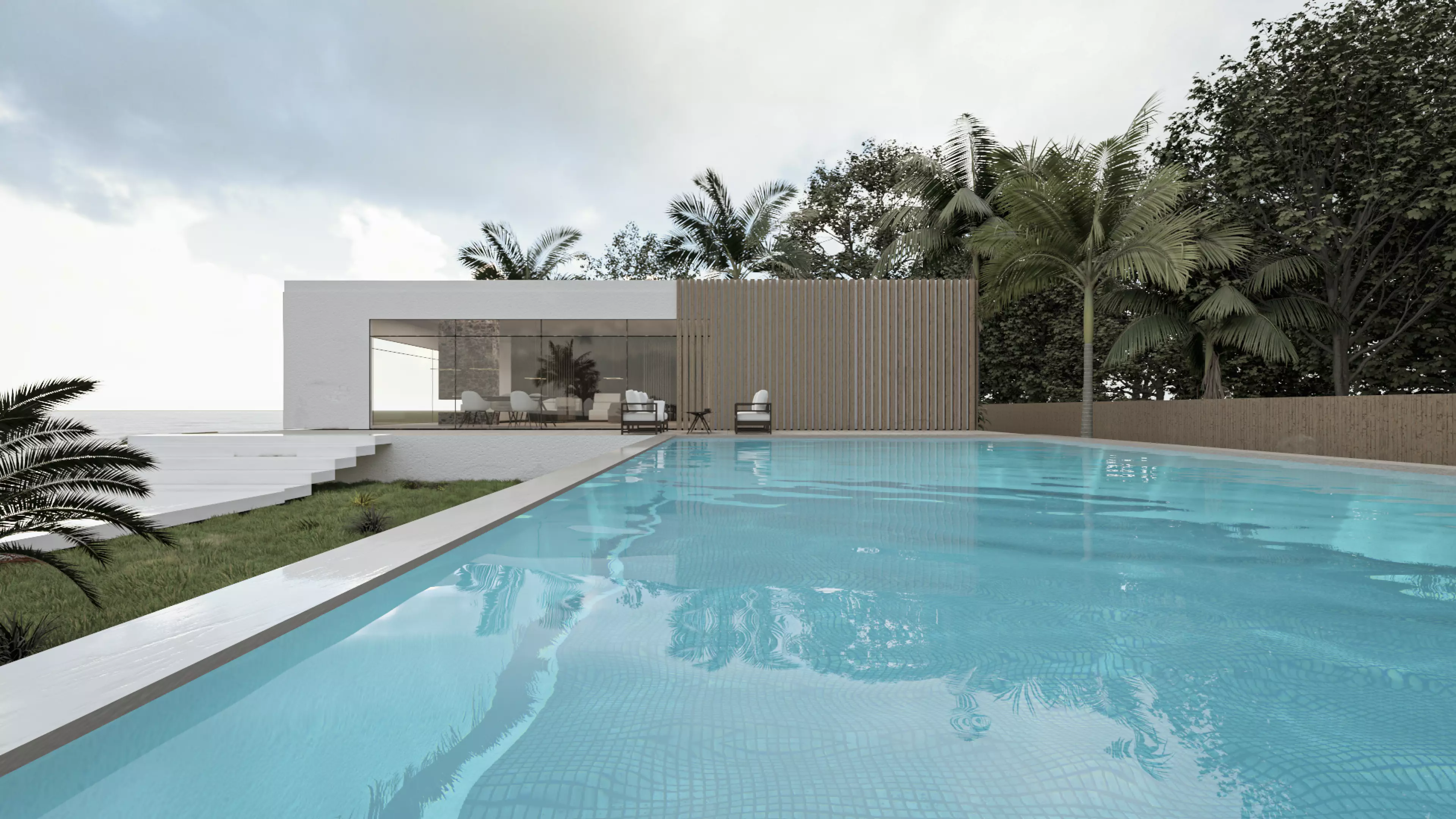 This is a minimalist 1+1 modern house exterior scene designed for architectural visualization.The entire exterior was fully modeled and textured. Materials were assigned only inside Lumion — no external libraries were imported.