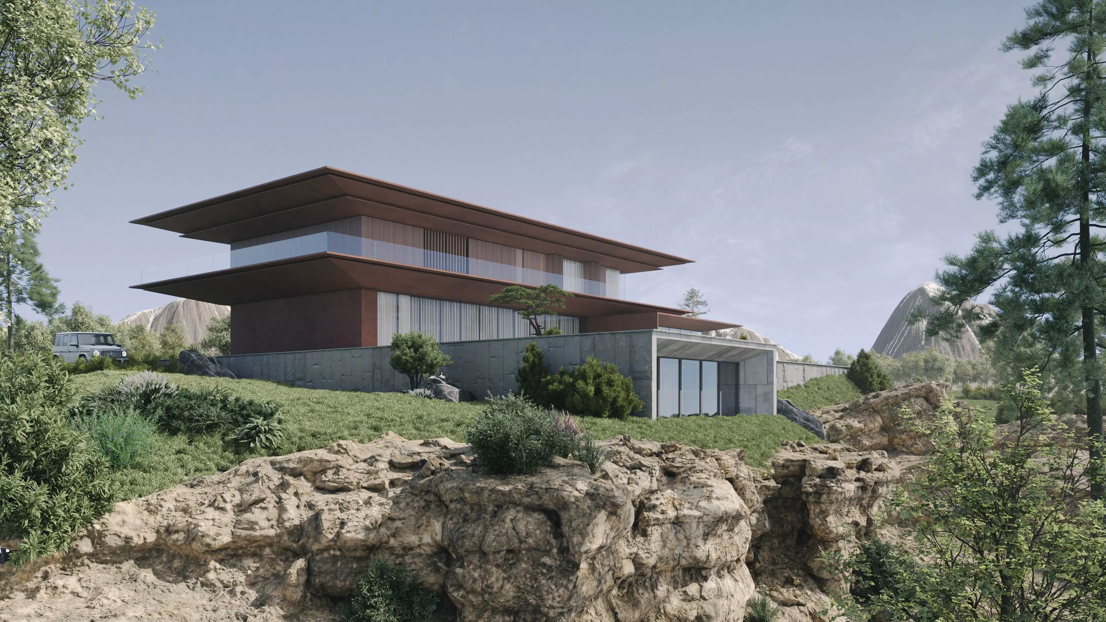 Overview: Step into a breathtaking architectural visualization with this Modern Cantilever Mountain Villa. This high-end exterior scene is a perfect study of Mountain Modernism, blending bold architectural volumes with a rugged, untamed natural environment. Featuring massive foreground boulders, a luxury white SUV, and a stunning cantilevered roof design, this scene is ready to render and highly optimized for professional use.