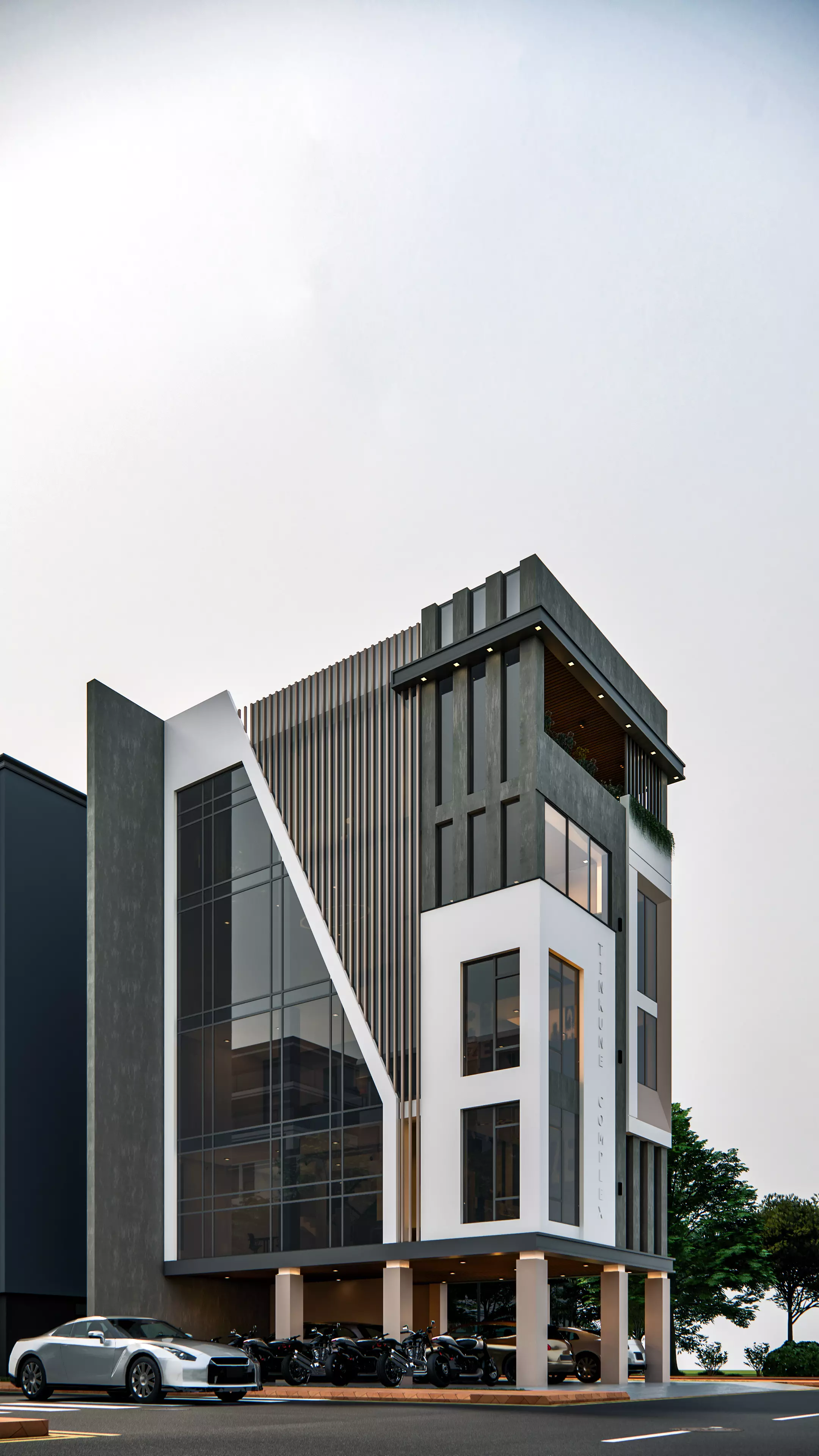 Present your architectural projects with confidence using this premium modern commercial building 3D model, designed with clean geometry and optimized for Enscape real-time rendering. This striking multi-storey structure is perfect for commercial proposals, mixed-use developments, visualization portfolios, and urban design concepts.This design features a bold contemporary aesthetic, blending sharp geometric lines, contrasting materials, and expansive glass façades that create a sleek professional look. Vertical fins, textured wall panels, and a double-height glass entry volume add architectural depth and realism. The upper floors incorporate floor-to-ceiling windows and a partially open terrace area, ideal for showcasing office, co-working, or retail use.At the ground level, the building includes an open parking canopy supported by clean structural columns, enhancing realism for city-based renderings. Exterior details such as vehicles, greenery, lighting, reflective glazing, and clean material transitions elevate your final presentations instantly.Why This Model Stands Out