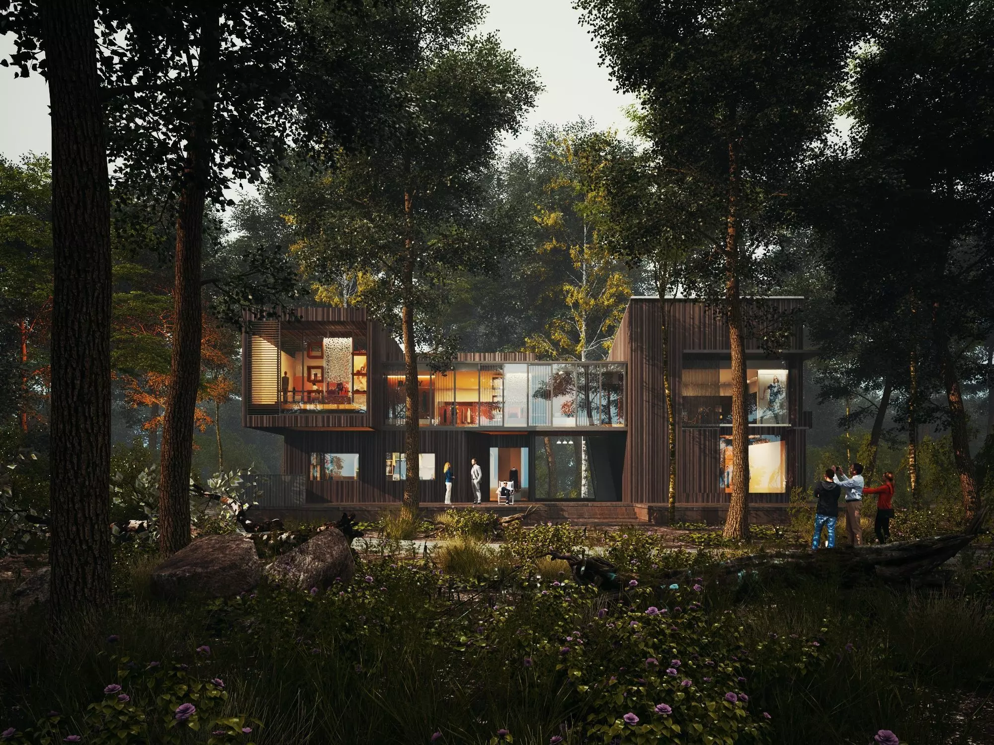 This 3D model features a modern forest house, designed with a contemporary architectural style and strong integration with the natural environment.The building is characterized by clean volumes, large glass façades, warm interior lighting, and a balanced combination of wood and modern materials.