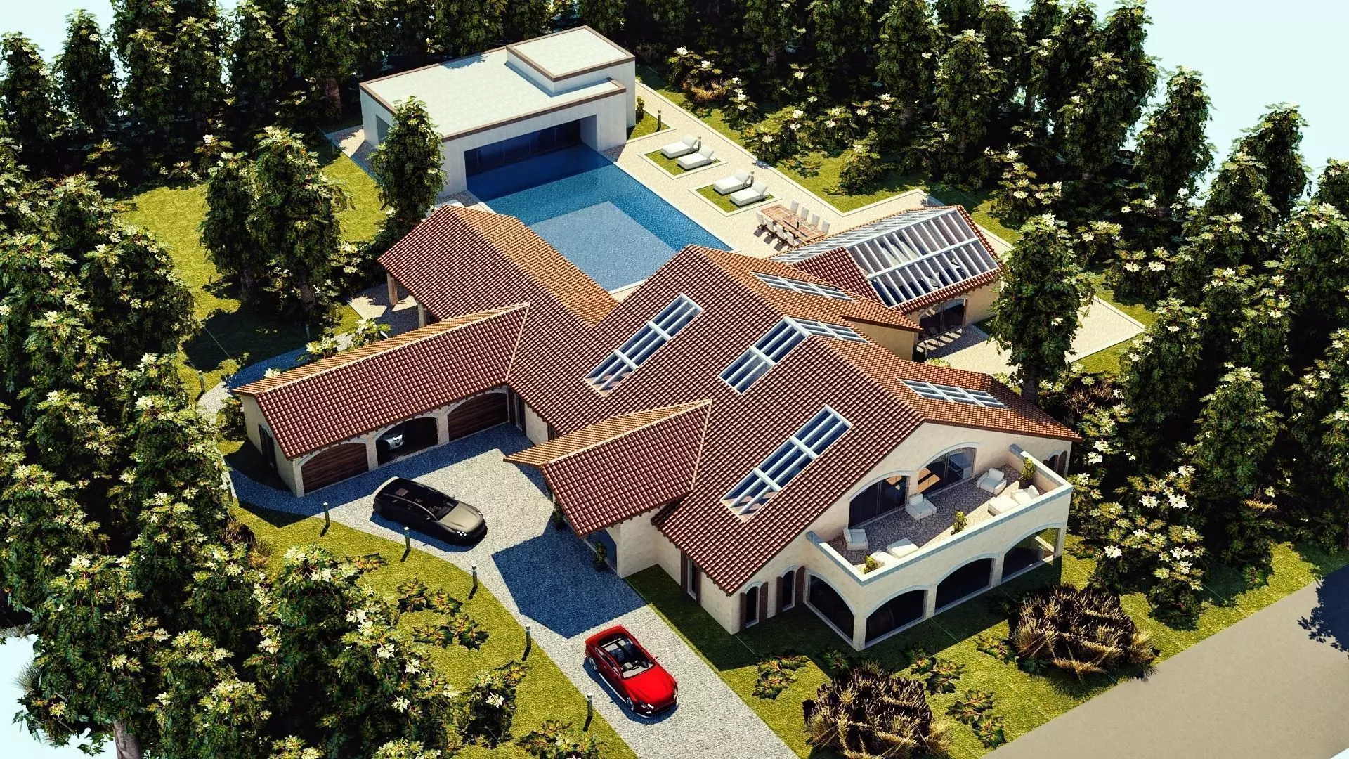 1 Bar, 1 livingroom, 2 bedrooms, 1 office, 1 kitchen, 1 dining room, 4 toilets, 1 bathroom, 1 pool, 1 jacuzzi, 3 car garage, 1 outdoor terrace with roof