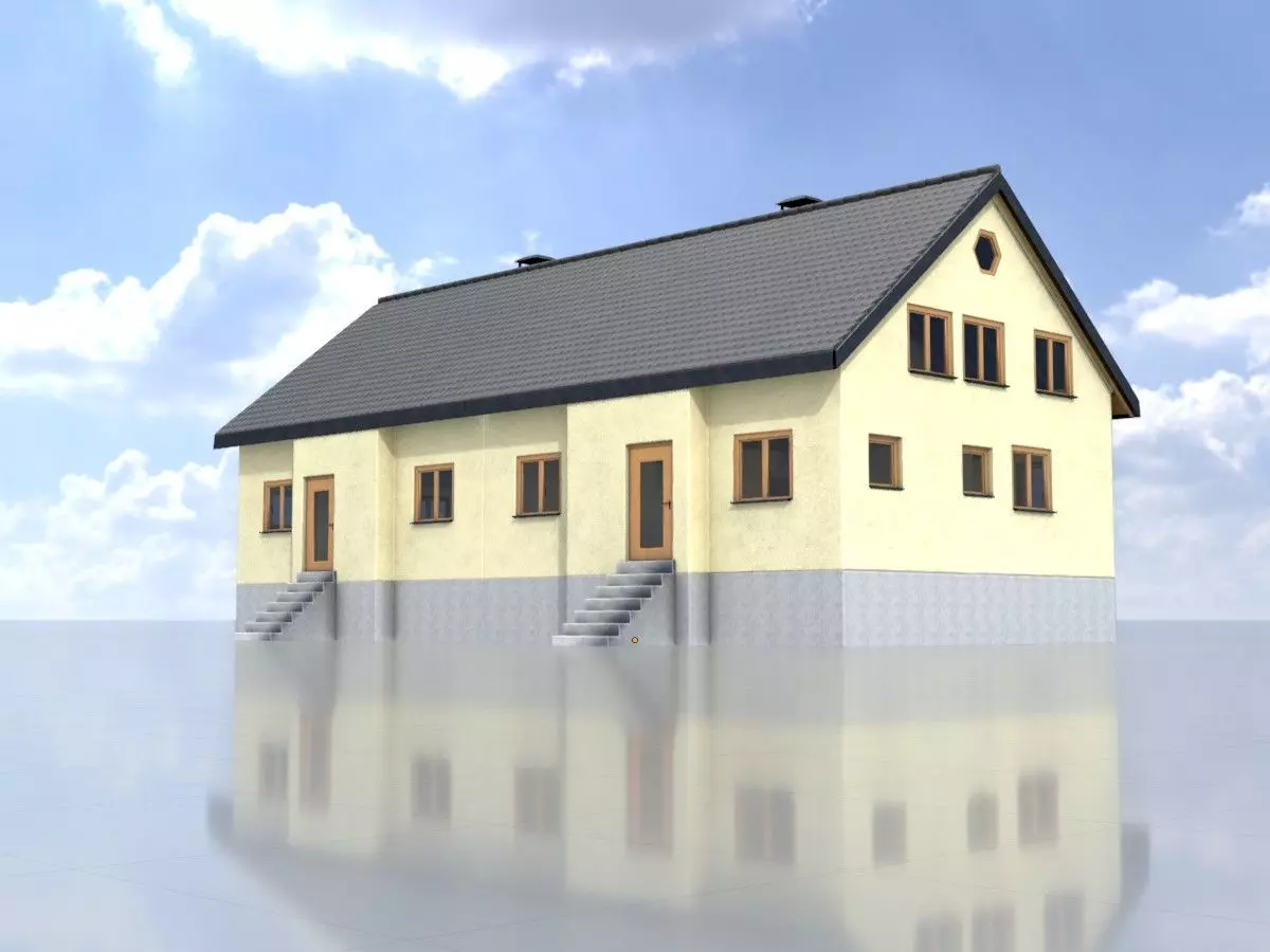 • Hier sehen Sie ein 3D-Modell eines Mehrfamilienhaus mit Fundament und Treppe im Eingangsbereich.