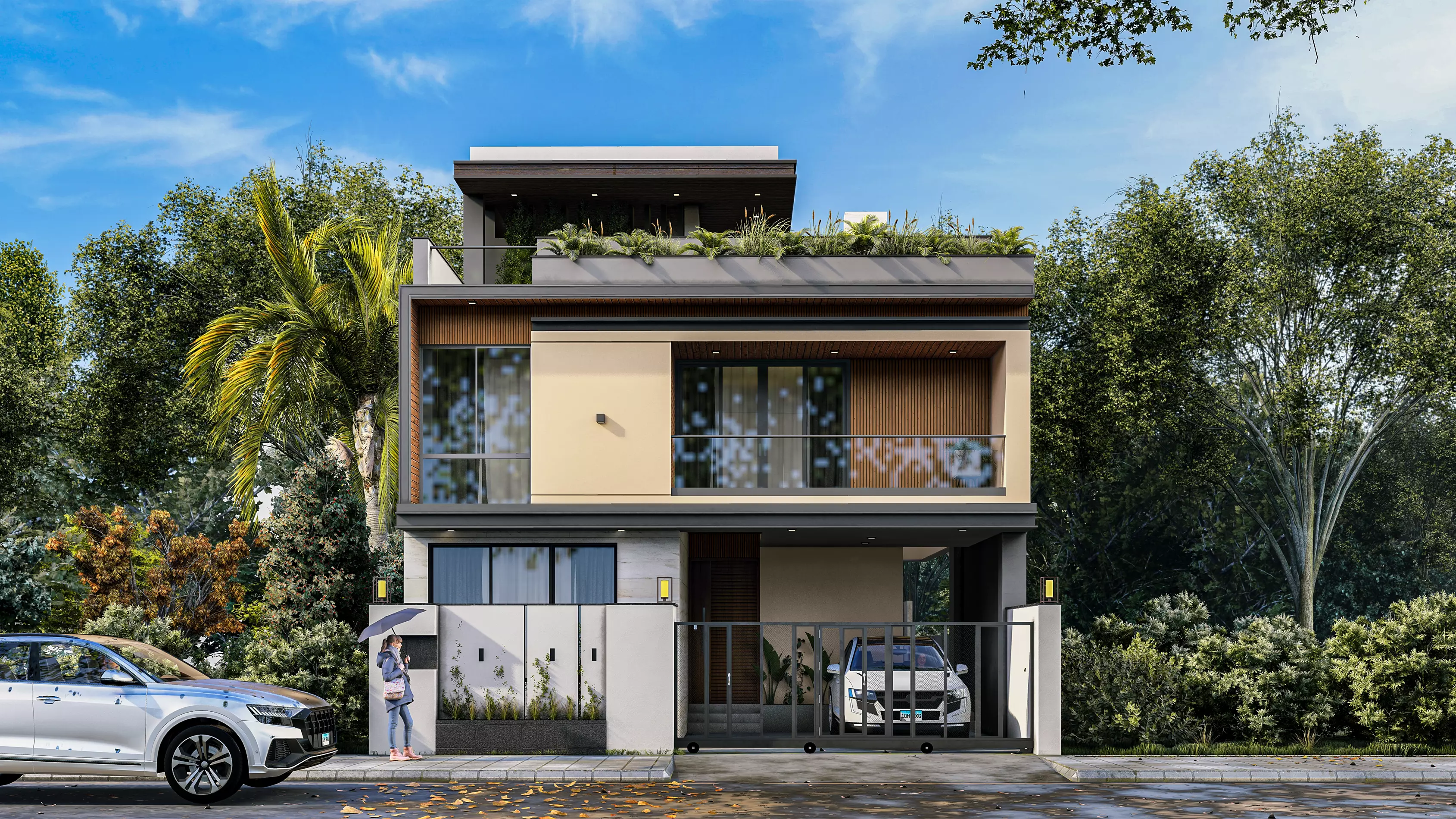 - Modern Façade Design: The clean rectangular massing is accentuated by warm wood-textured paneling, subtle lighting fixtures, and a soft neutral color palette.