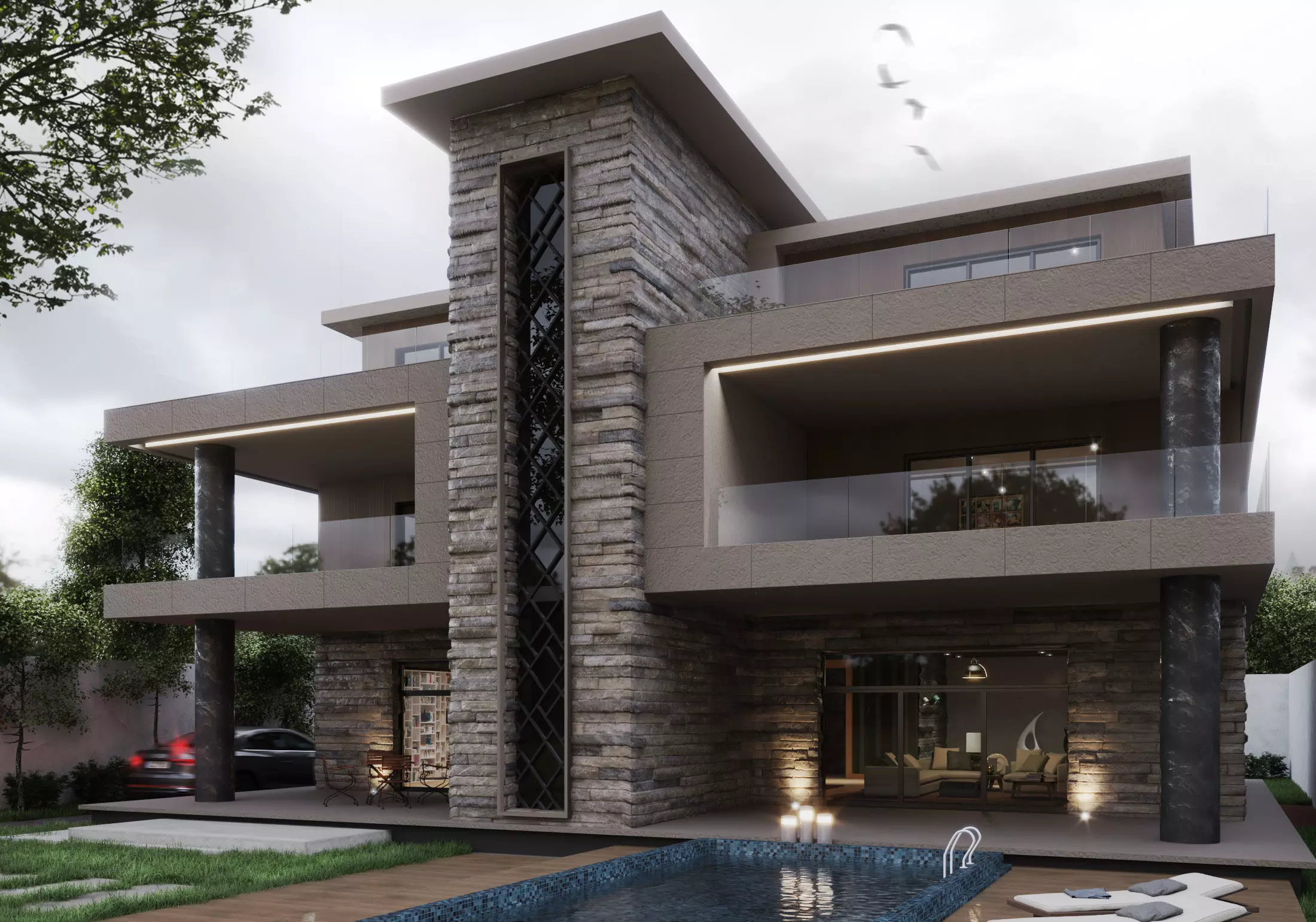 3ds file contains 3 levels villa model and its yard, car model, trees, and lawns(using forest pack)
