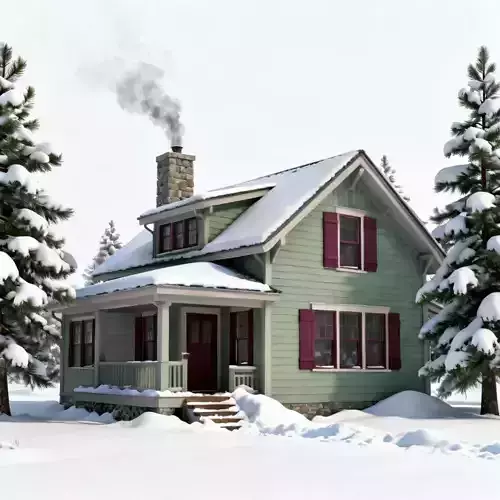Towering Pine Trees The house is framed by large, snow-covered pine trees on both sides. These environmental elements are included to show how the asset fits into a forest setting, enhancing the cozy, secluded atmosphere.