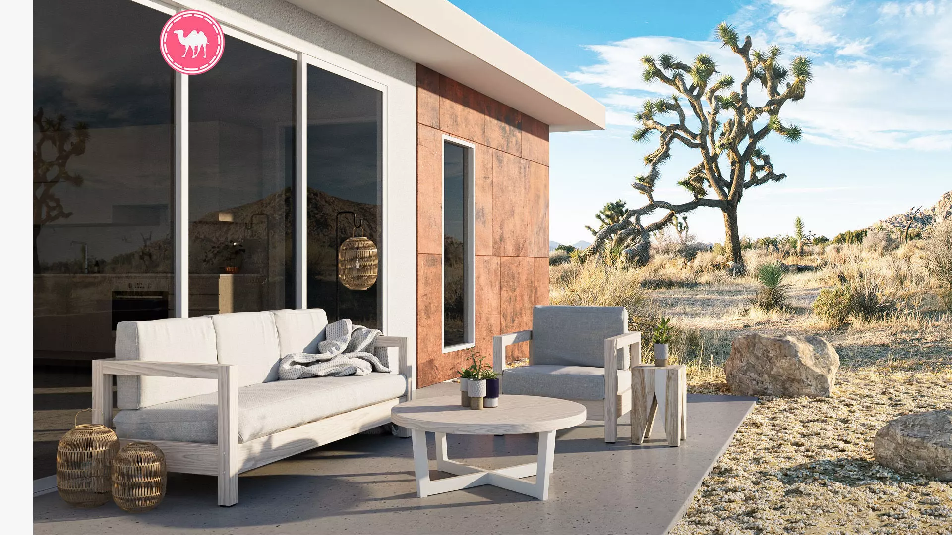 This outdoor set is inspired by Tropical and Bohemian design. This set of furniture matches the typical oasis type arid environment.