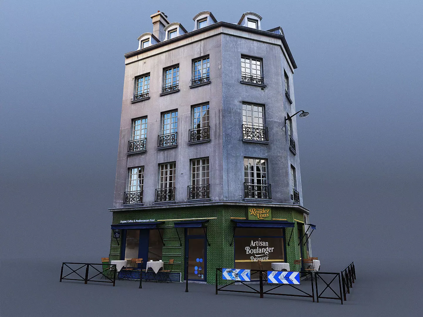 I'm happy to present you a new model, a corner parisian building in modest style, built in the style before Haussmann's Paris architectural reformation, I gave a name Paris Randezvous house to this building.It's modeled in freestyle mode based on real building from panoramic streetview images.I enchanced few areas and assets, made it more visually plausible by adding more grunge textures, so it could contain hopefully more storytelling potential.