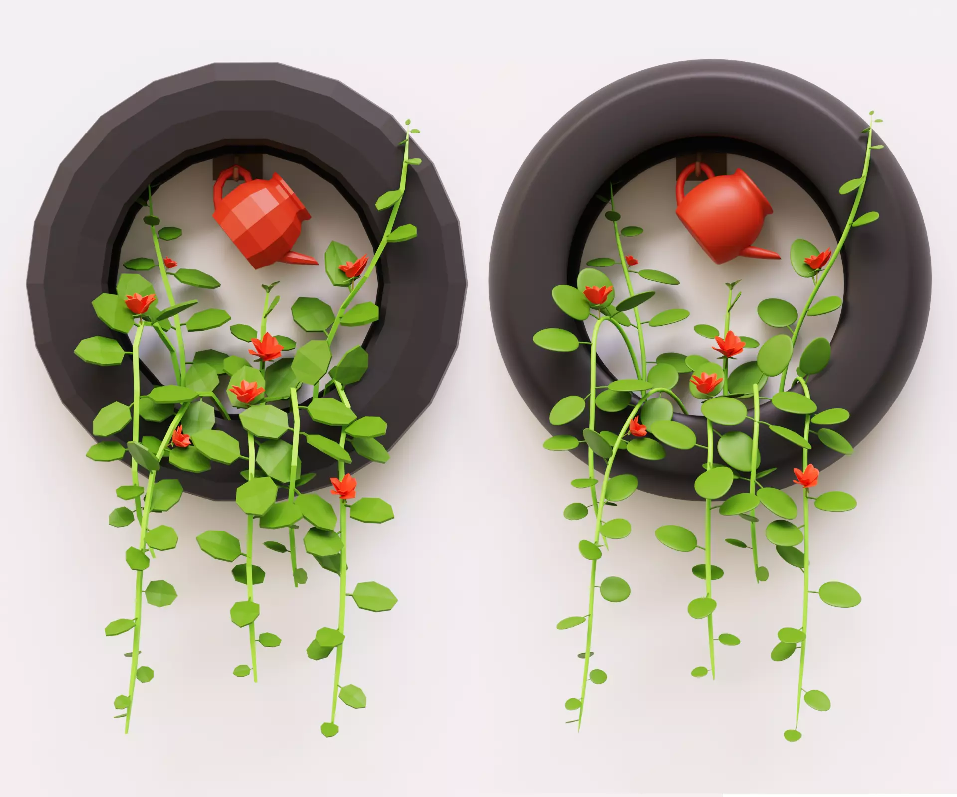Hello! This is a 3D model of a plant on the wall.The model consists of 5 separate objects: wheel, hook, teapot, plant and ground.There is only one model on the stage, everything superfluous has been removed, and the logically correct names have been set.The blender file has the materials set up.