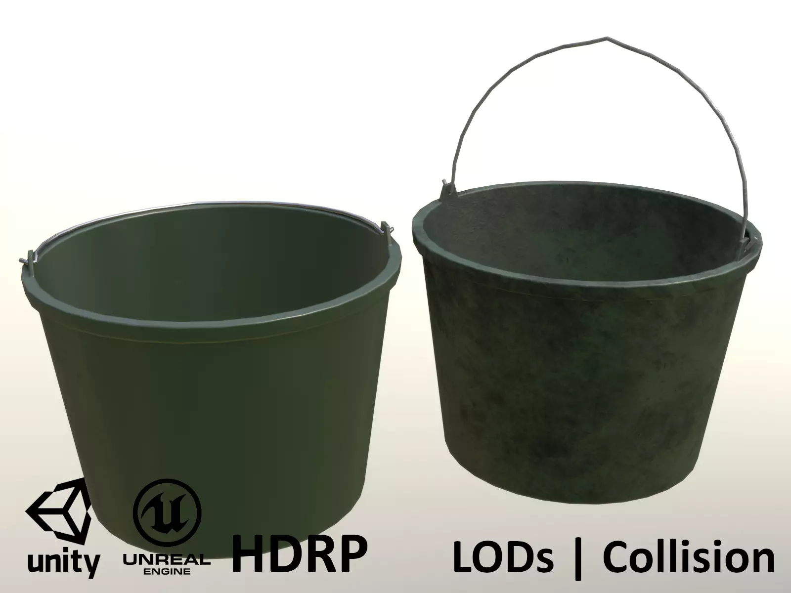 Rendered with Eevee (also with different HDRIs). Two mesh objects - handle is parented to a bucket. Single material. UV mapped for most optimal use of UV space. Metric units.