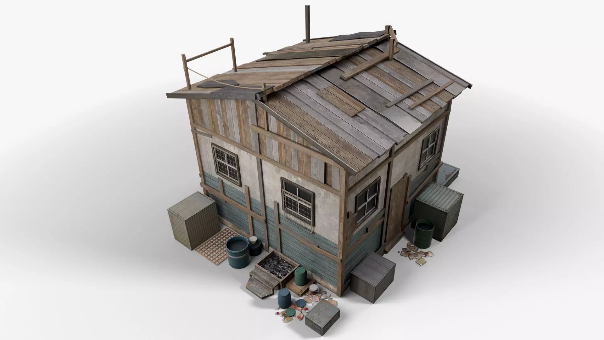 Game-ready low-poly PBR model of a post-apocalyptic wooden house.Optimized for real-time use in Unreal Engine and Unity.Suitable for survival, open-world, RTS, post-apocalyptic, horror, wasteland, and cinematic environments.