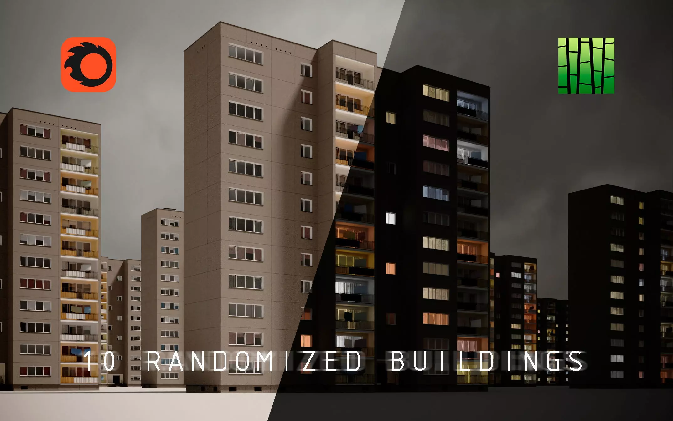 The asset consists of 10 pre-fabricated panel buildings (12 floors), which have the same volume, but are fully randomized. Check the previews.