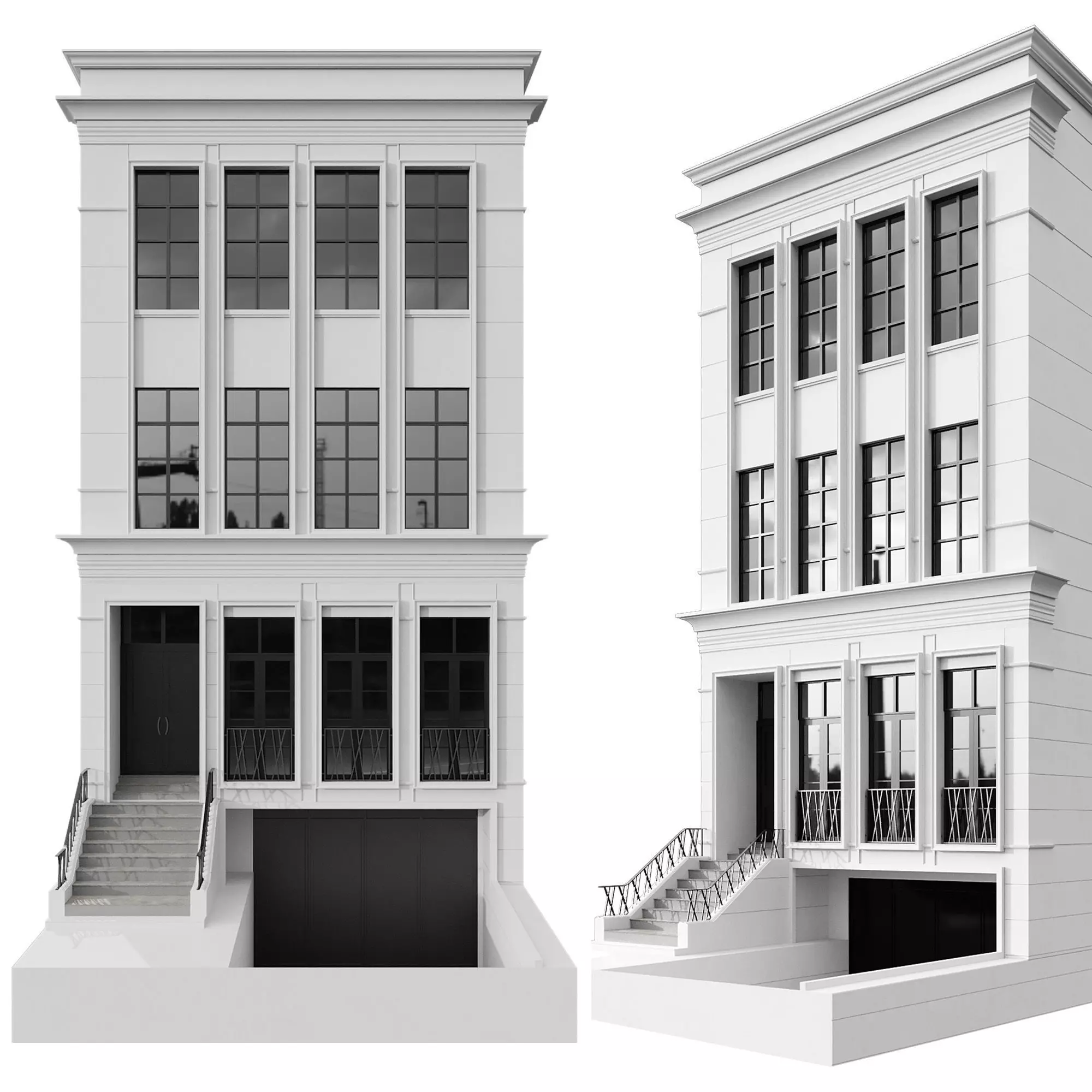 High-quality 3D model of a classic residential building with elegant façade details. The design includes three floors with tall windows, decorative framing, a main entrance with stairs, and a basement garage. Perfect for architectural visualization, urban design projects, and realistic renders.