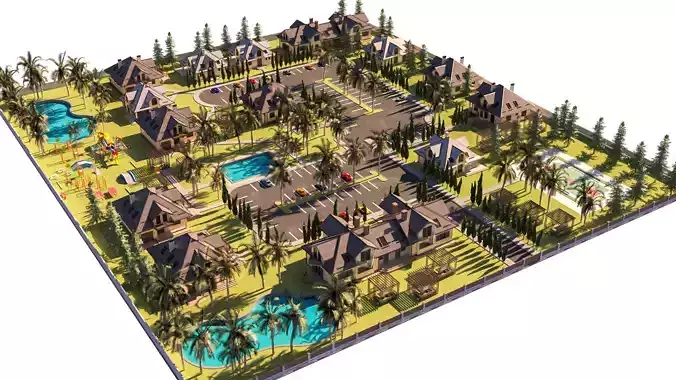 Complete Mini-Community: The model includes a clustered arrangement of multiple detached villas/houses , providing a complete neighborhood setting.
