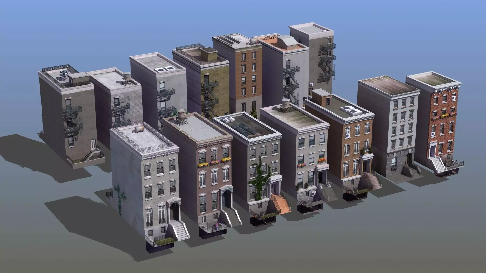 Row Houses Set. 14 detailed town houses or row houses, as built on east coast USA (NYC, Boston, Philly, Washington DC). Models uses 53 power-of-two-res square color maps. Textures are included in their own archive download (zip).