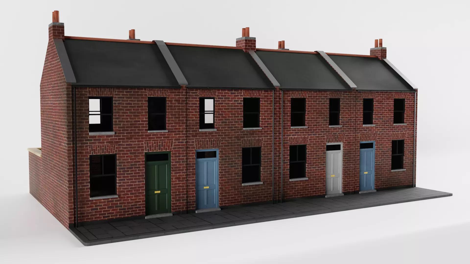 The model has real world scale and measures approximately 11.5 m in depth, 18.1 m in length and 8.19 m in height. Only the outside of the house is detailed, but the walls are solid, the chimneys reach all the way to the ground and the walls seperating the homes are existent (the fourth preview image shows the third home's inside).