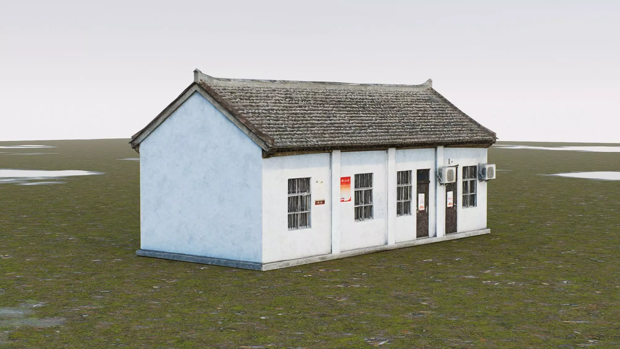 This 3D low-poly model represents a typical single-story rural self-built house commonly found in Chinese countryside settings. Featuring a traditional gabled roof with dark tiled shingles and light blue weathered walls, the structure reflects a modest yet functional architectural style. The building includes barred windows, external air conditioning units, and posted notices—details that suggest its use as a small community facility, village office, or residential unit. Designed with optimized geometry for real-time applications, this model is ideal for urban planning simulations, game environments, or digital reconstructions of rural landscapes.