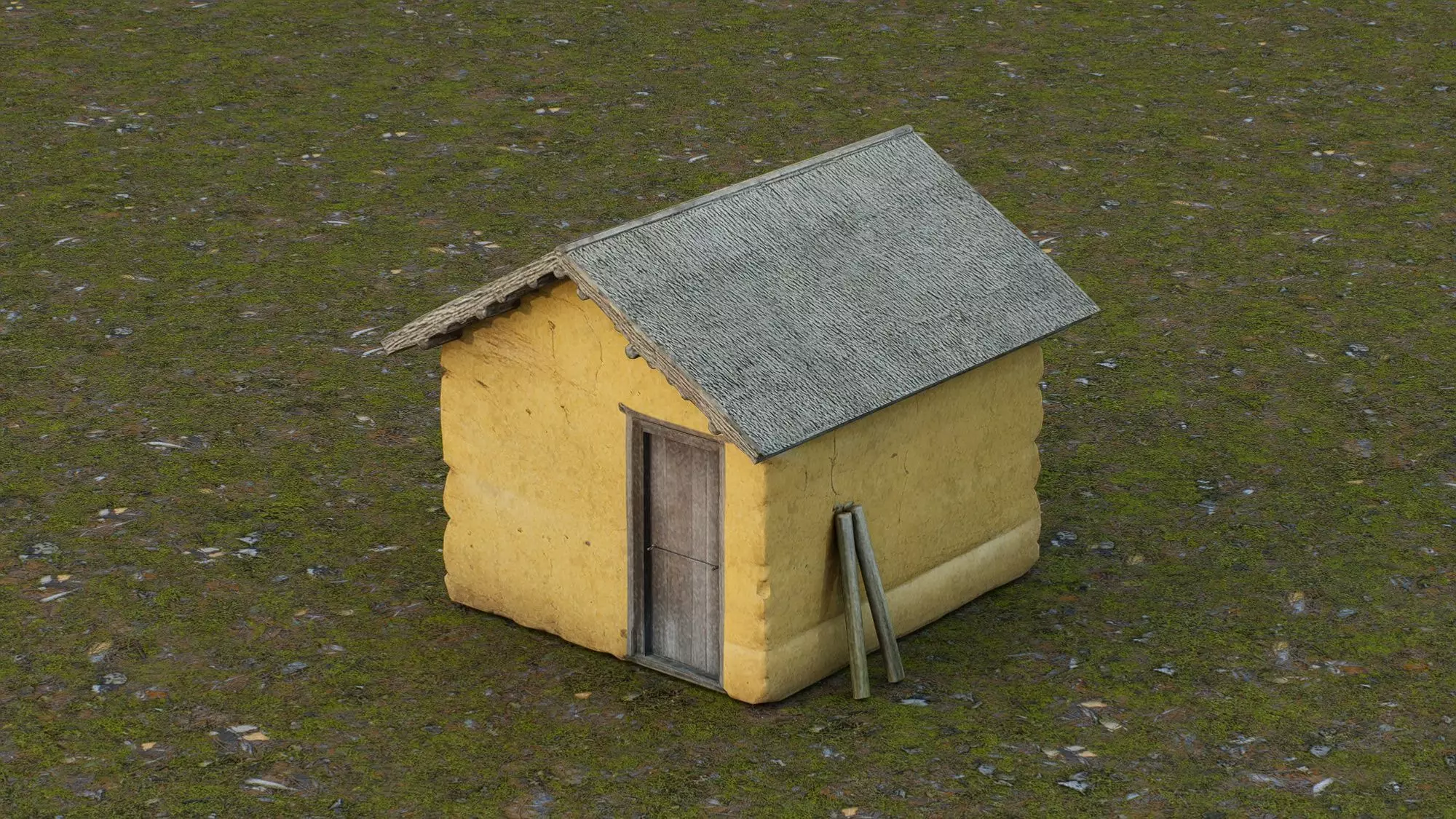This 3D low-poly model depicts a rustic rural warehouse, designed with a simple yet functional structure typical of traditional countryside storage buildings. Constructed from textured yellow adobe or mud-brick walls and topped with a weathered thatched roof, the shed features a single wooden door and minimal detailing, emphasizing practicality over ornamentation. A pair of leaning wooden planks adds to its aged, utilitarian appearance. Ideal for use in historical simulations, farming environments, or game asset libraries, this model captures the essence of modest agricultural storage architecture.