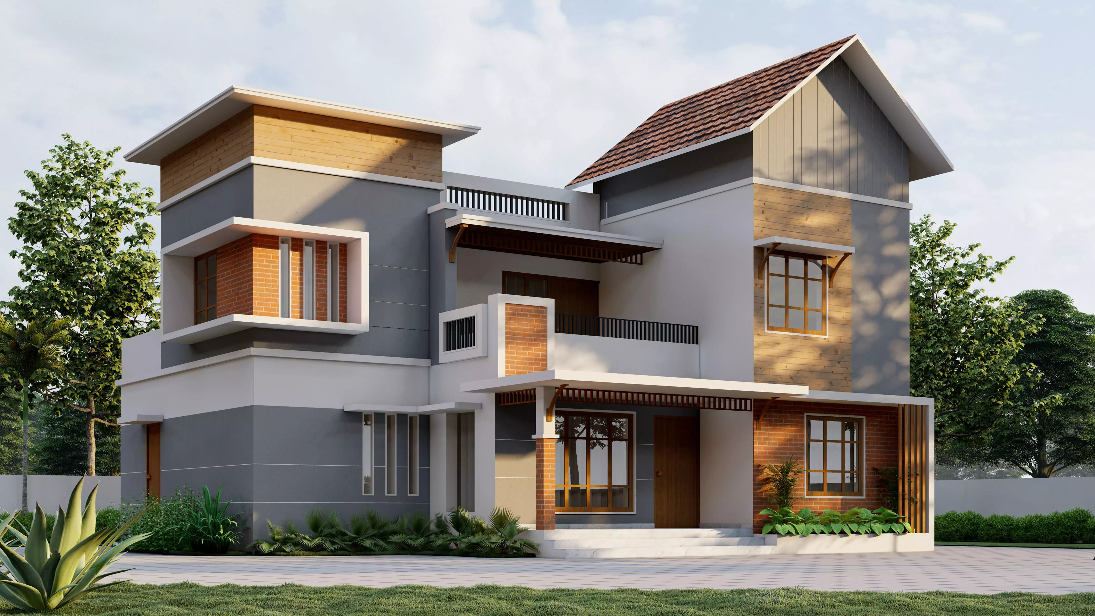 A semi-contemporary house 3D model, thoughtfully designed by blending traditional architectural elements with modern design touches. This design strikes a perfect balance between classic charm and contemporary elegance, making it suitable for a wide range of residential projects.