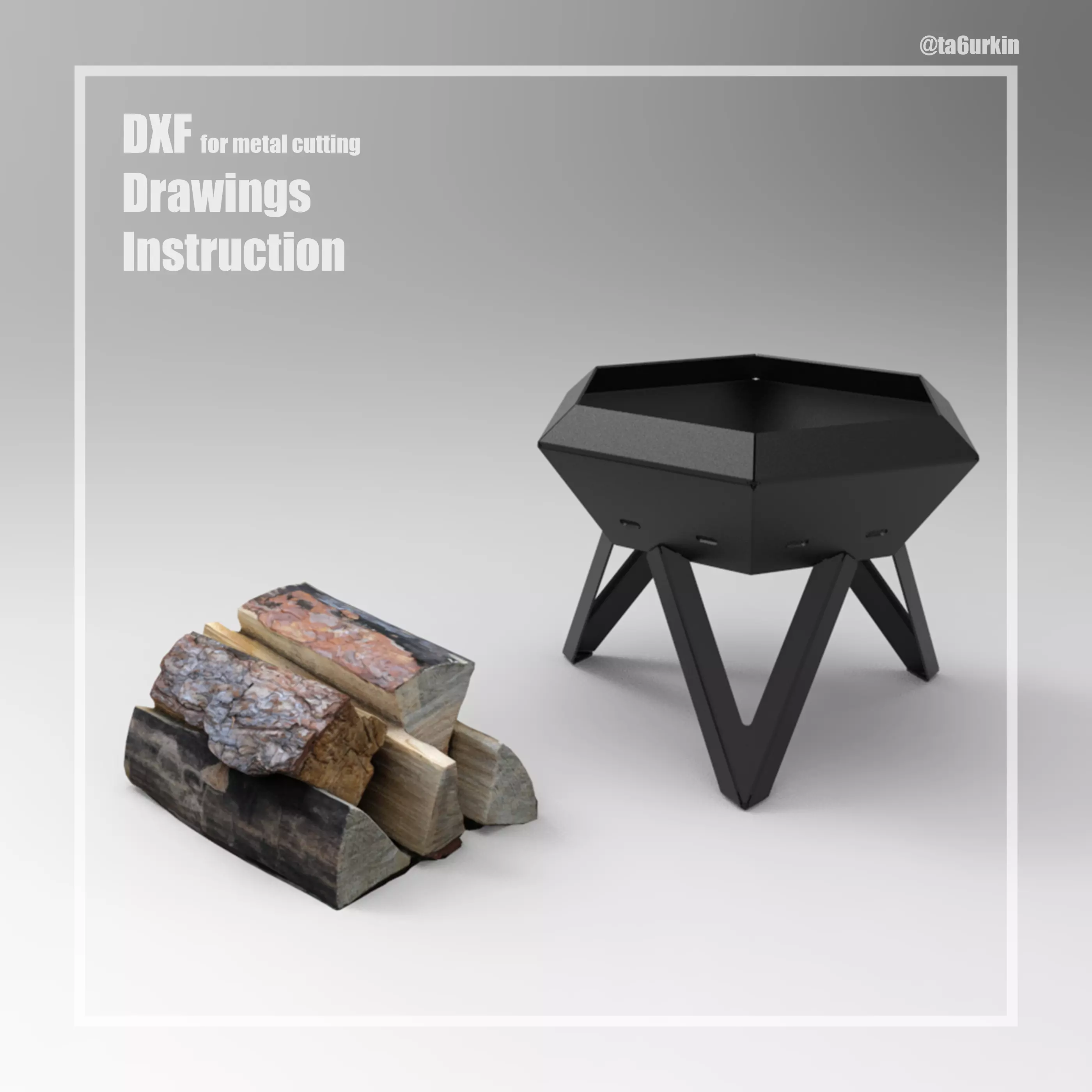 The Fire Pit 7 involves the manufacture of steel with a thickness of 3 mm and a bending radius of 3 mm. The minimum bending angle is 60,6 degrees, the maximum angle is 90 degrees. The weight of the fire pit is about 8,8 kg. There are 10 parts in total. The design documentation includes 6 pages, 3 of which are bending drawings. The instruction includes 3 pages in the order of assembly. The bend line is drawn along the cutouts in the part, in accordance with the drawing. The archive includes: dxf (4 pcs.- files separately), Drawings (6 pages), Instructions (3 pages). Overall dimensions of the fire pit (LxWxH): 500х440х355.