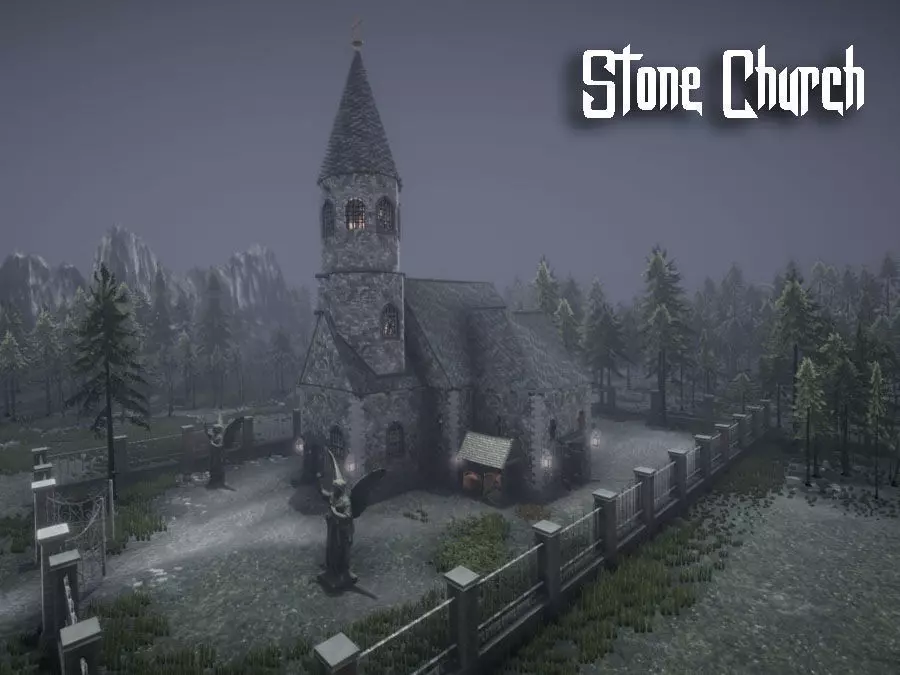 The pack includes a game-ready church 3D model with additional props inside like benches, cabinets, chandeliers, candles and others. Including exterior elements such as angel statues, fence, gate, sacks, wooden roof and others.