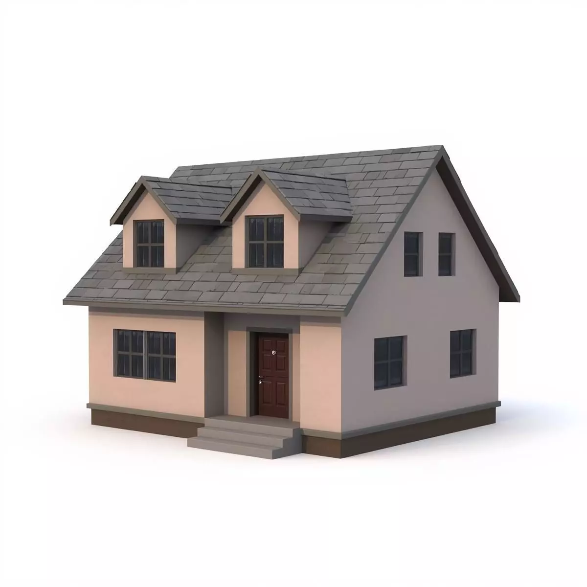 Material Palette: The siding is rendered in a soft peach/tan tone, contrasted by dark grey shingles on the roof and a dark brown foundation base.