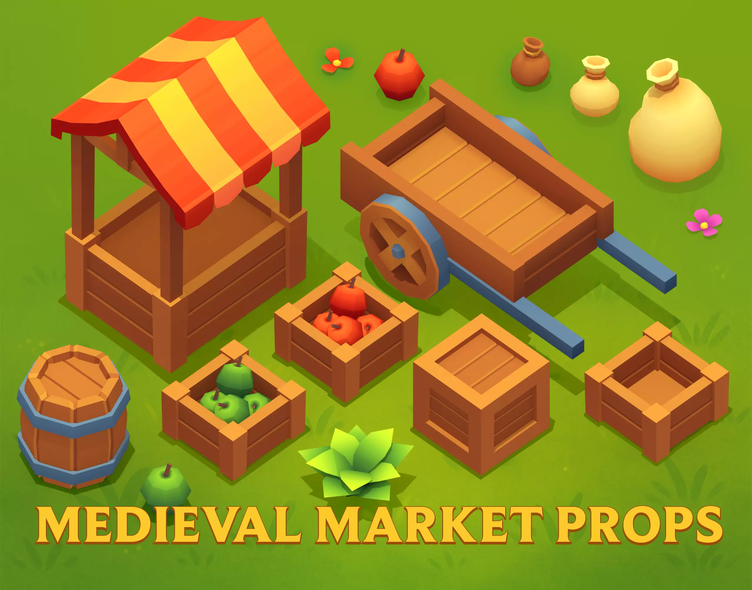 This pack includes a collection of 15 stylized medieval market props, perfect for your casual or mobile game environments. It features colorful, low poly assets like market stands, crates, barrels, fruit boxes, carts, and decorative elements such as flowers and plants.