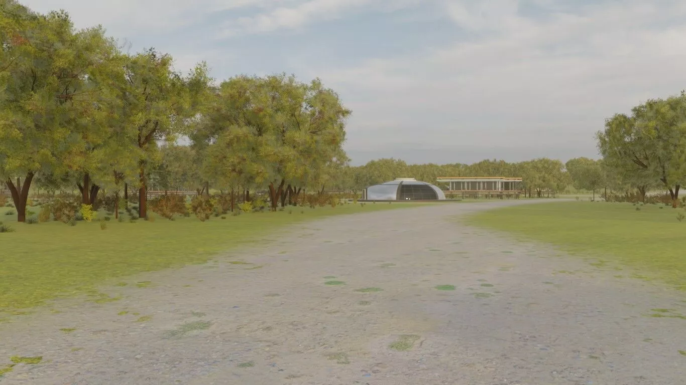 In full, unfiltered daylight, this realistic backyard feels quietly inviting. A sustainable residential community set in a lightly wooded landscape, featuring modern elevated homes, dome structures, ponds, and winding gravel roads, with cool, muted tones tying the composition together.