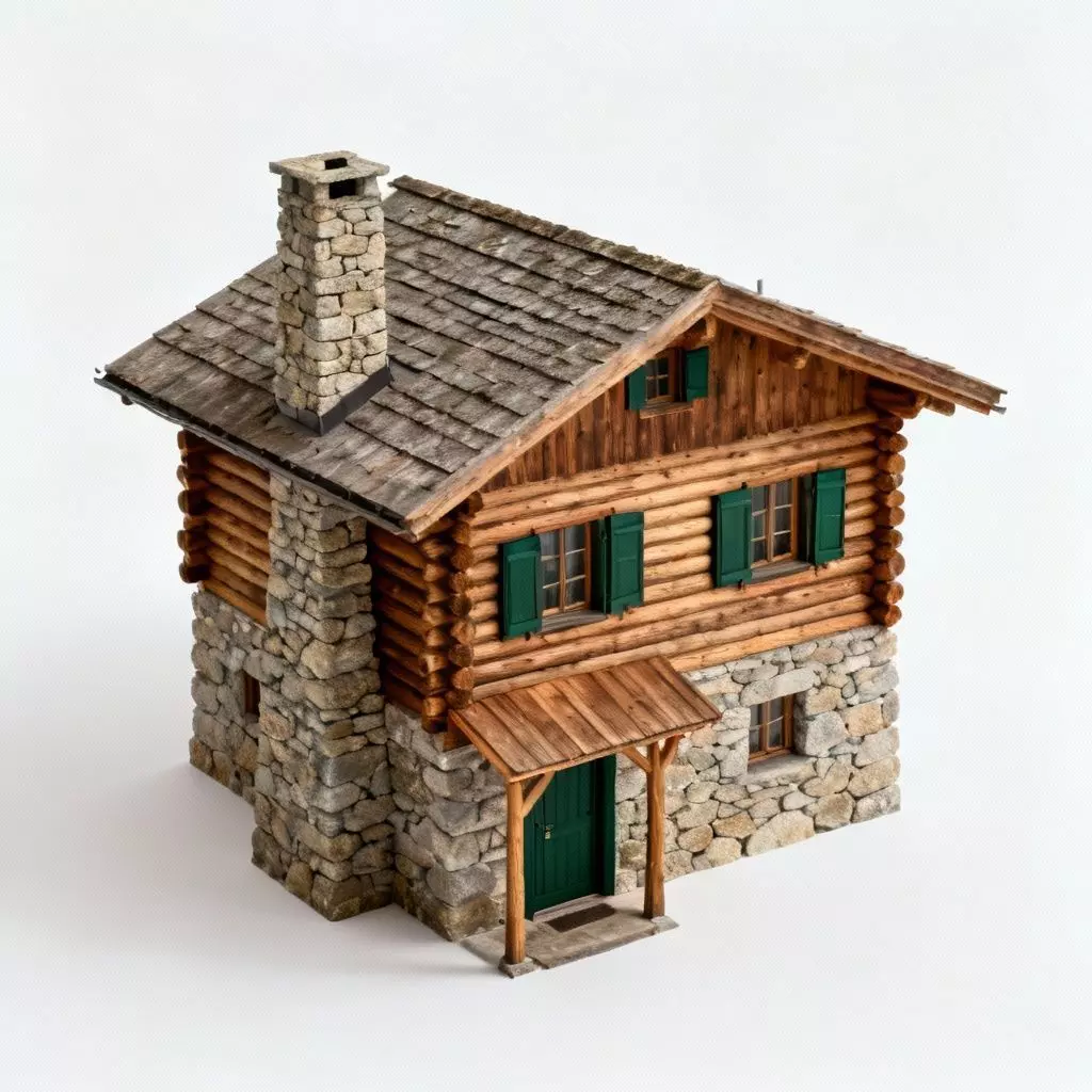 The Overall Concept This asset is a classic Alpine chalet, a type of house found in European mountain regions like Switzerland or Austria. It uses a mix of materials to create a sturdy, cozy home perfect for snowy environments.